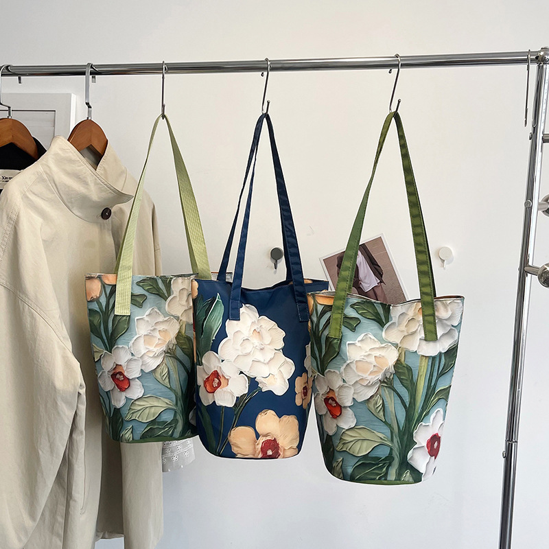 新款油画国风高级复古单肩便携尼龙包百搭小众大容量通勤水桶文艺
