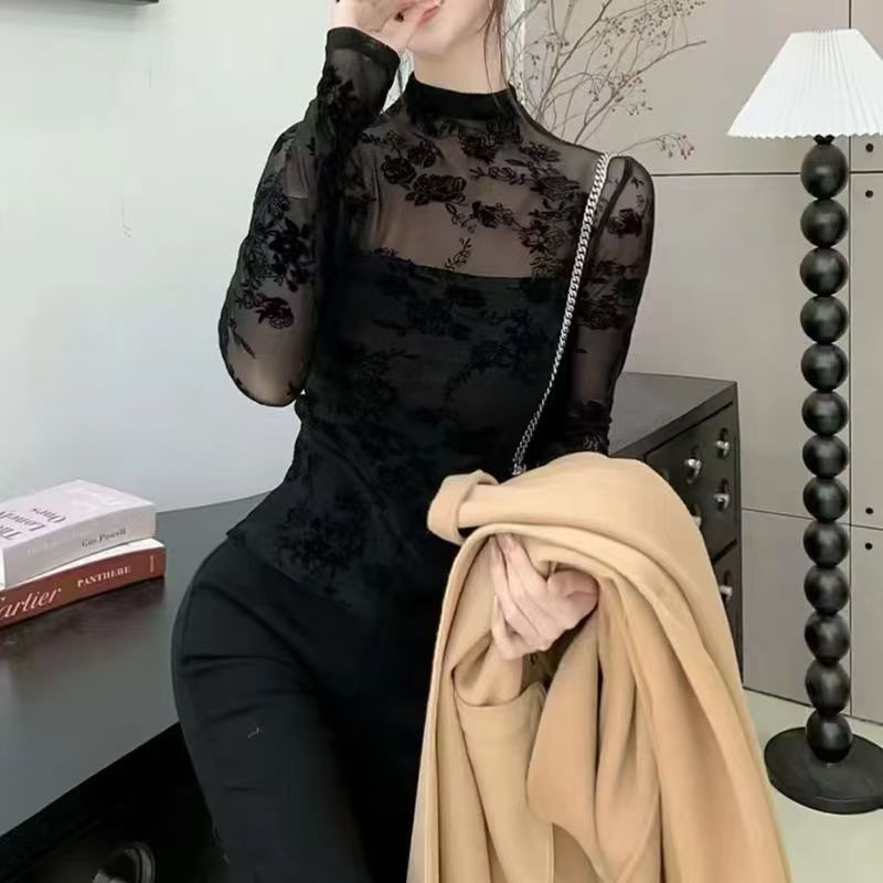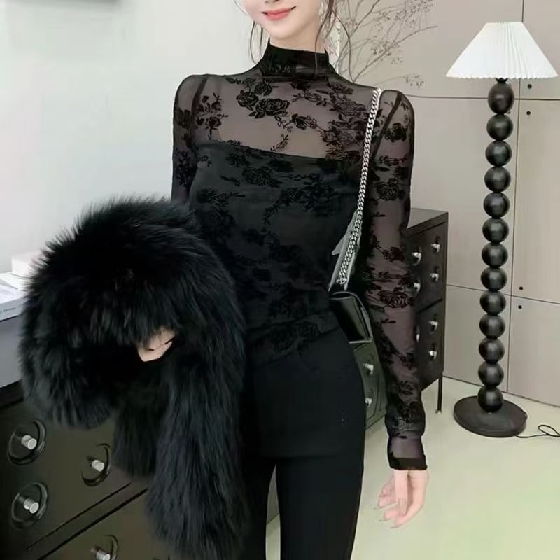 2024ベルベット半高襟修身レースシャツ長袖tシャツ女性韓国版気質ガードル