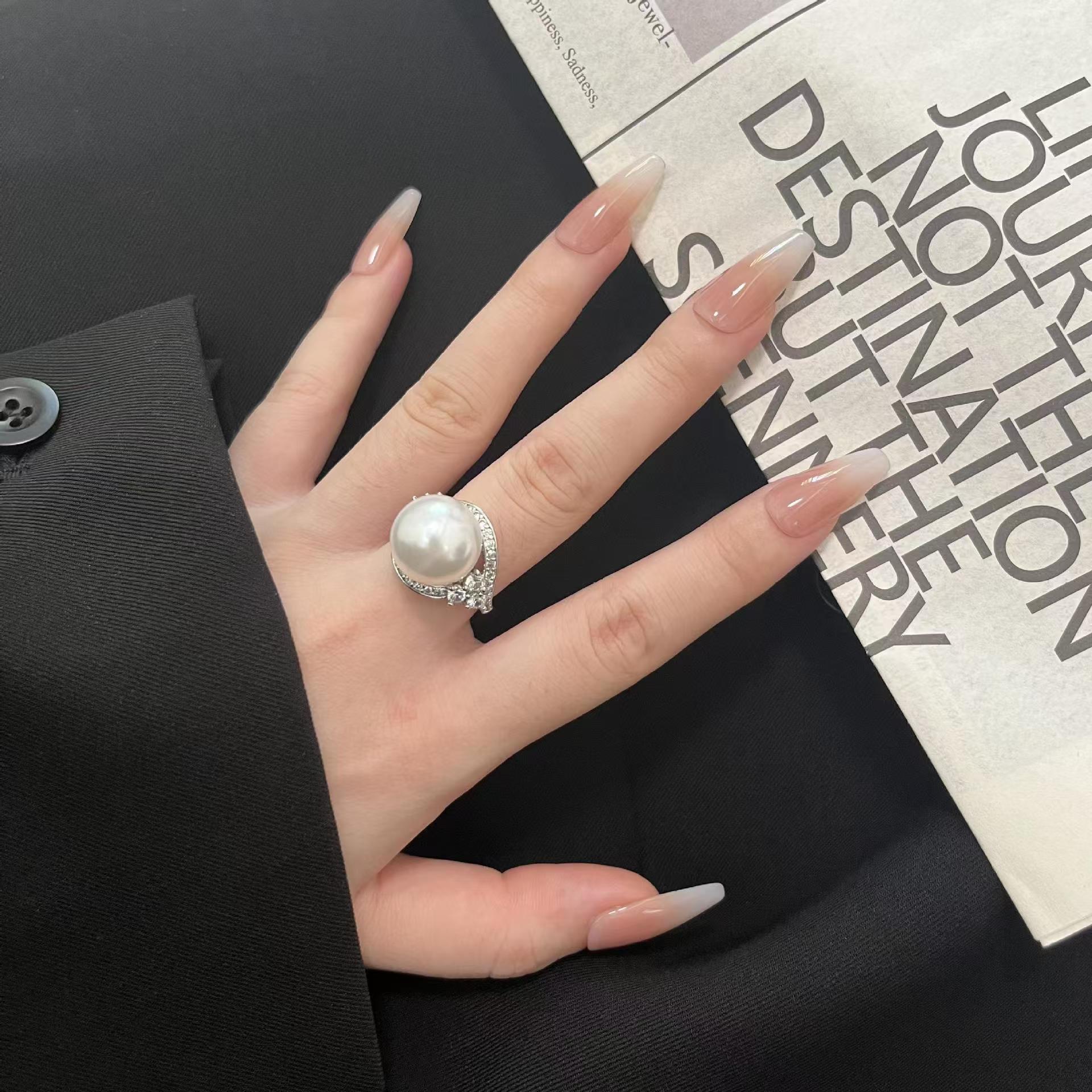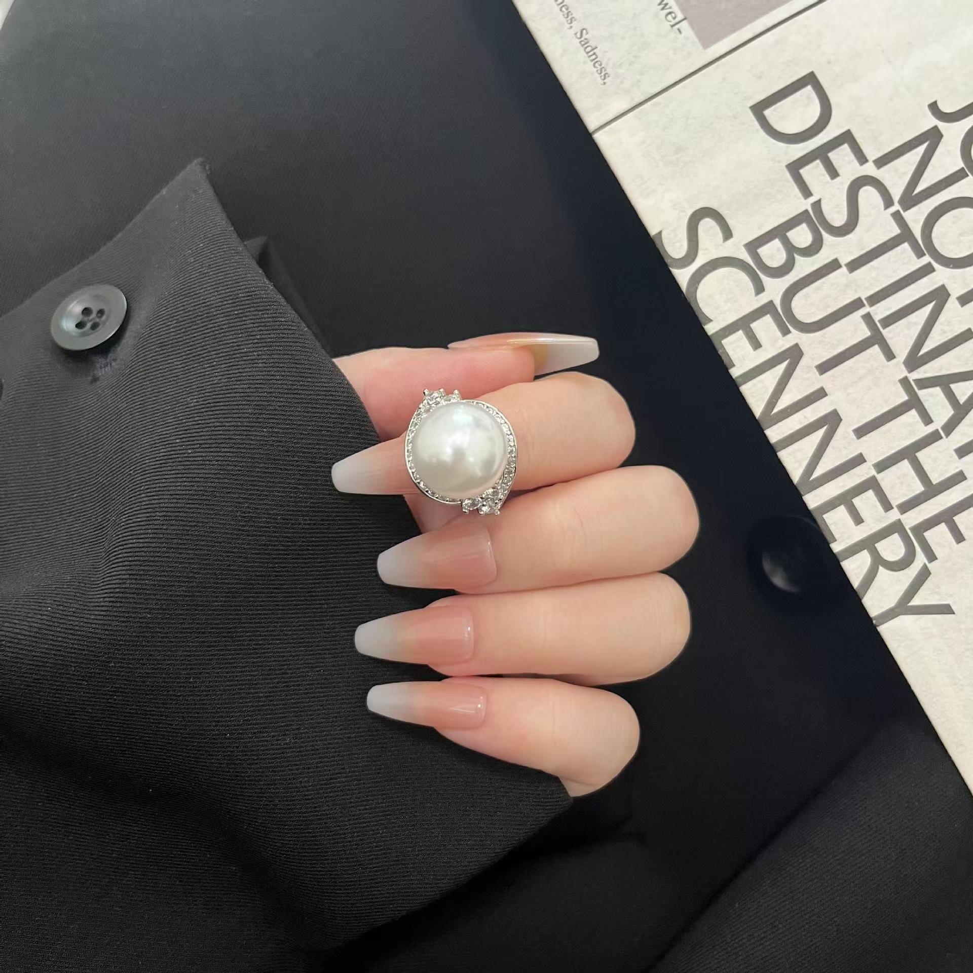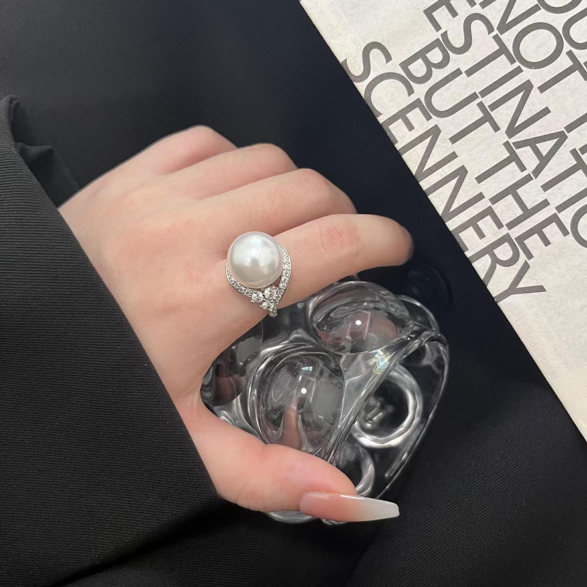 欧美抖音直播宝石白钻 贝母珍珠戒指女 宴会珍珠饰品可调节戒指