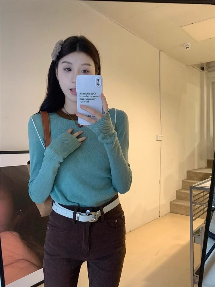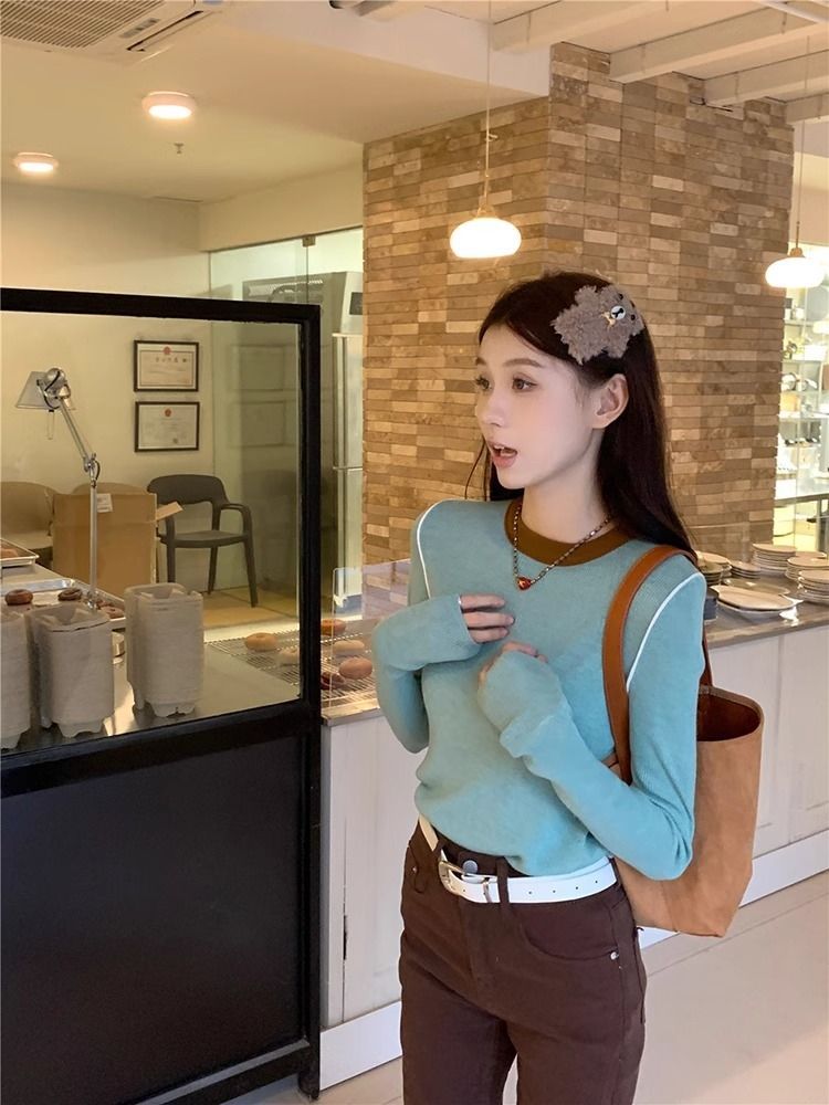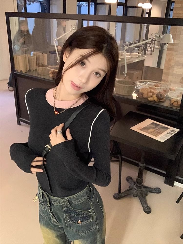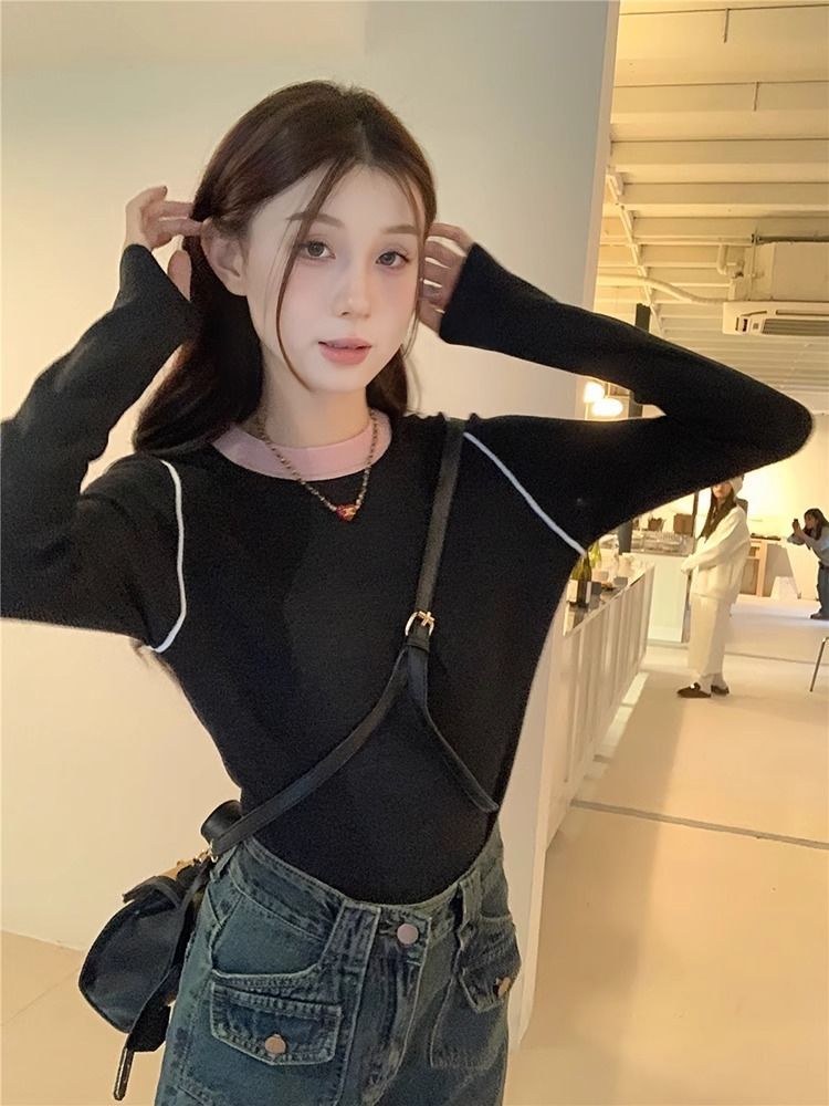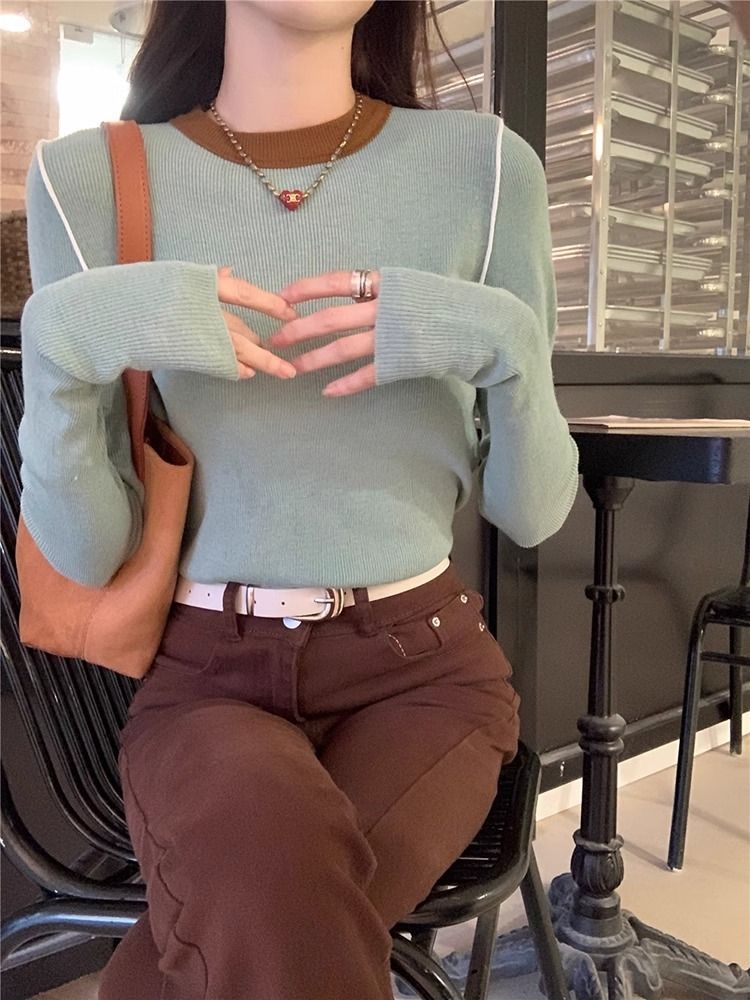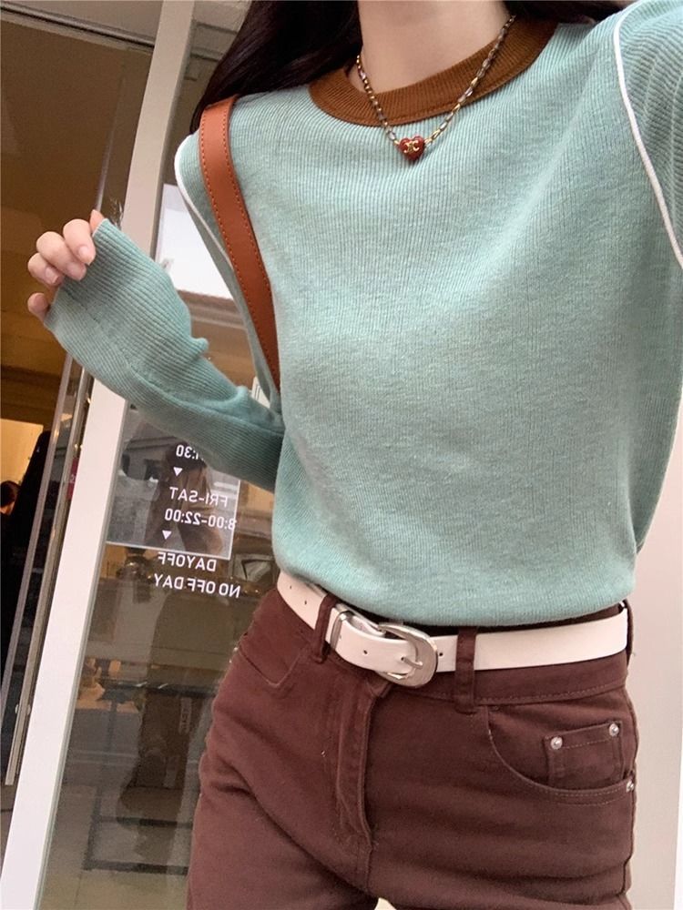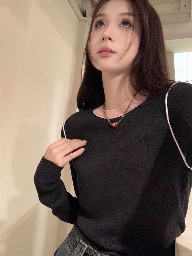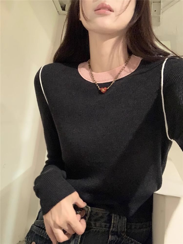 拼接撞色设计感翻领打底毛衣女春秋季修身显瘦气质加厚内搭针织衫