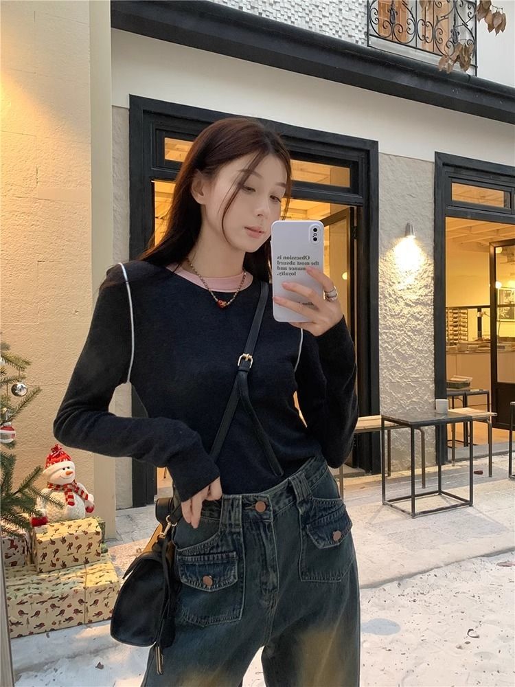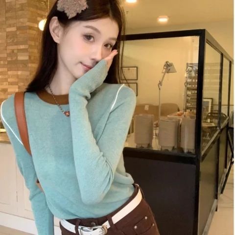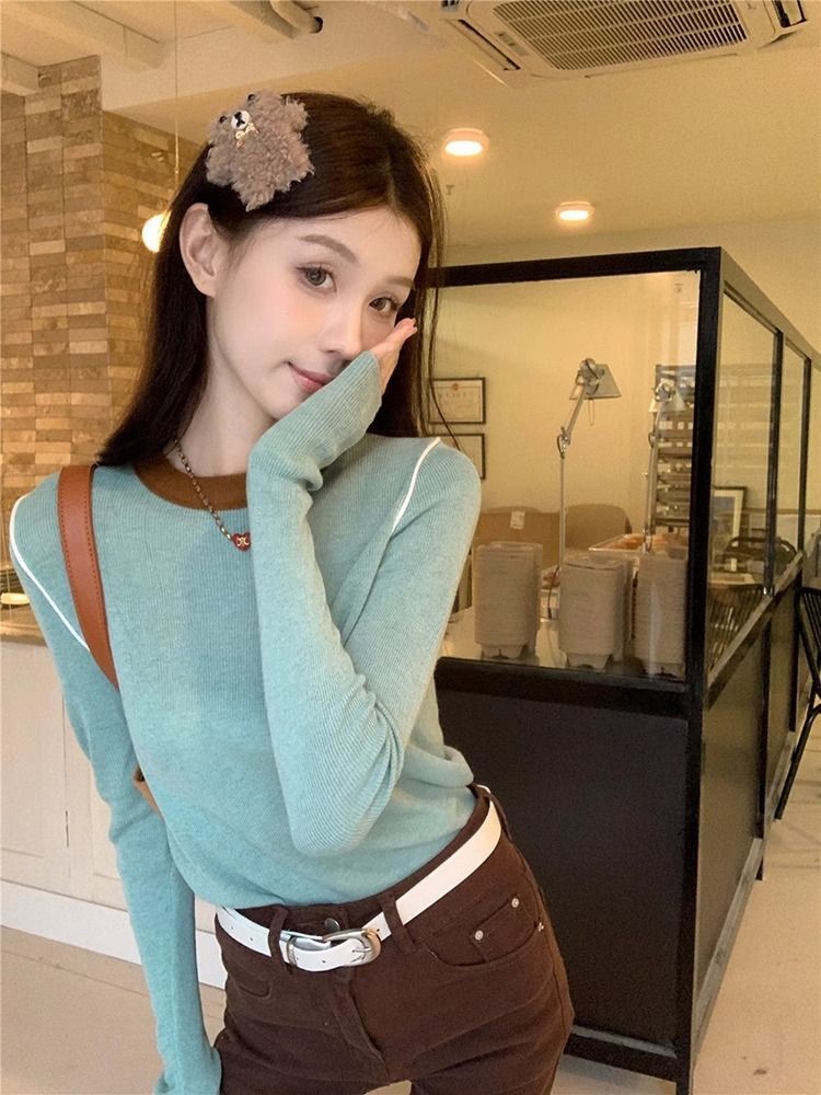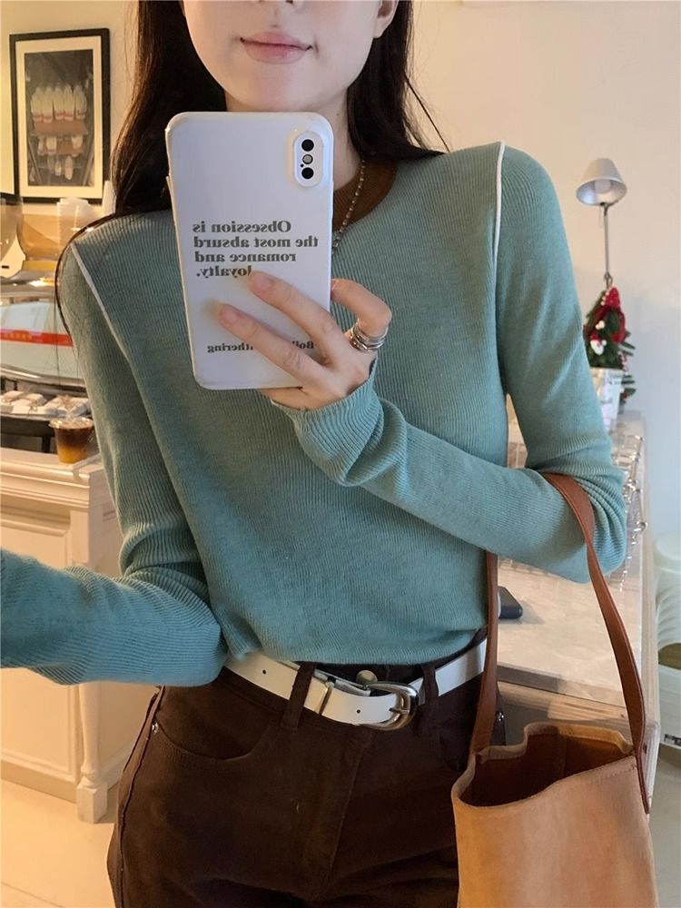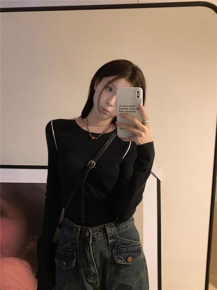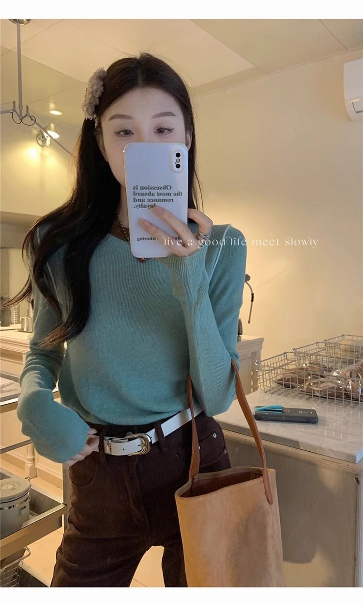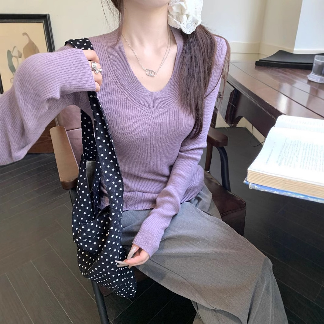 韓国版修身u襟気質ニット女性春長袖基礎モデルフランス低襟正肩底シャツ上着
