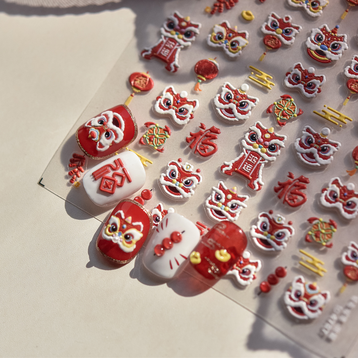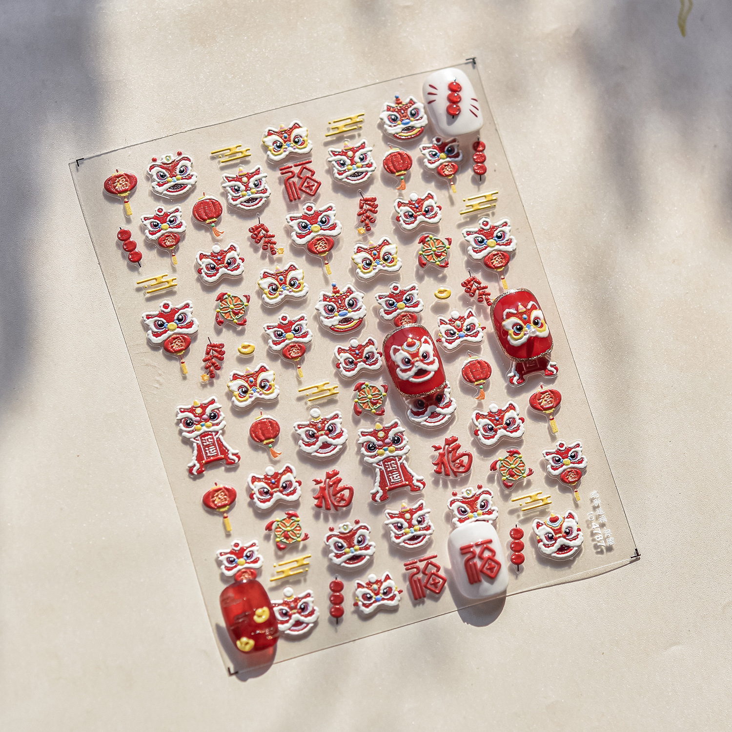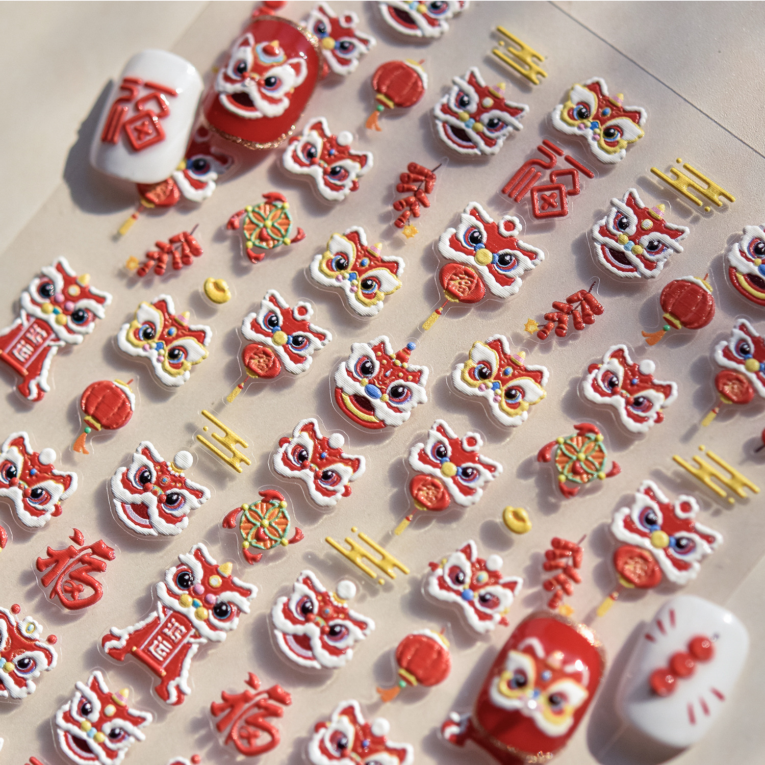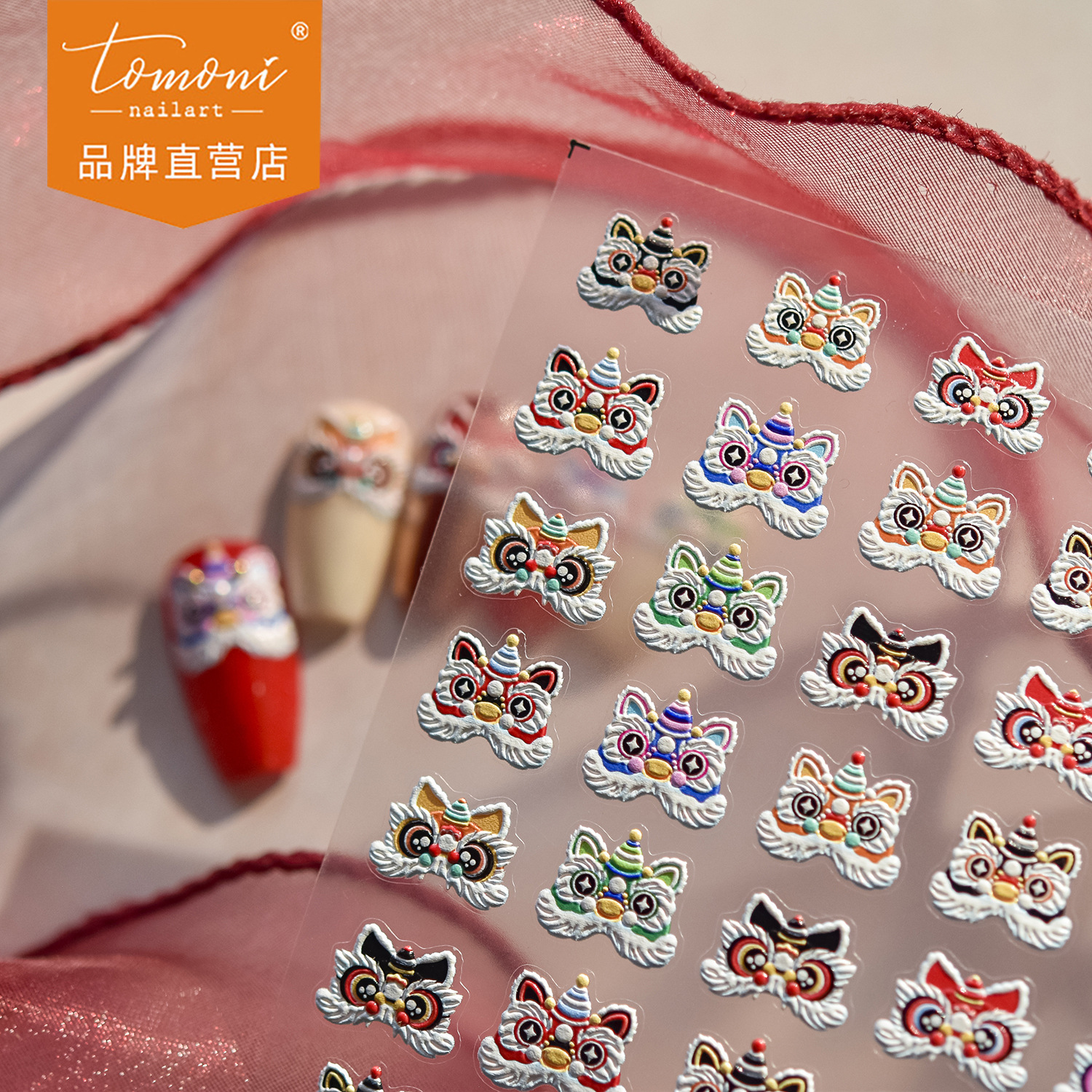 tomoni浮雕美甲贴纸爆款喜庆风国潮风指甲贴新年醒狮饰品贴纸素材
