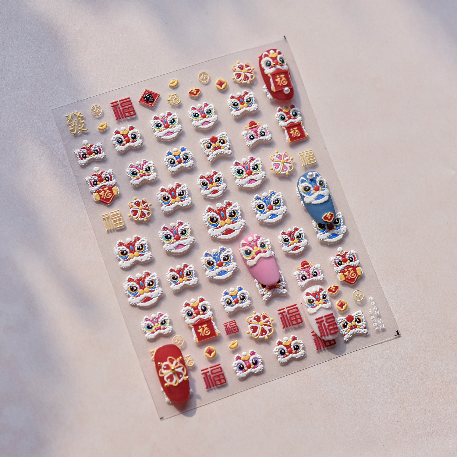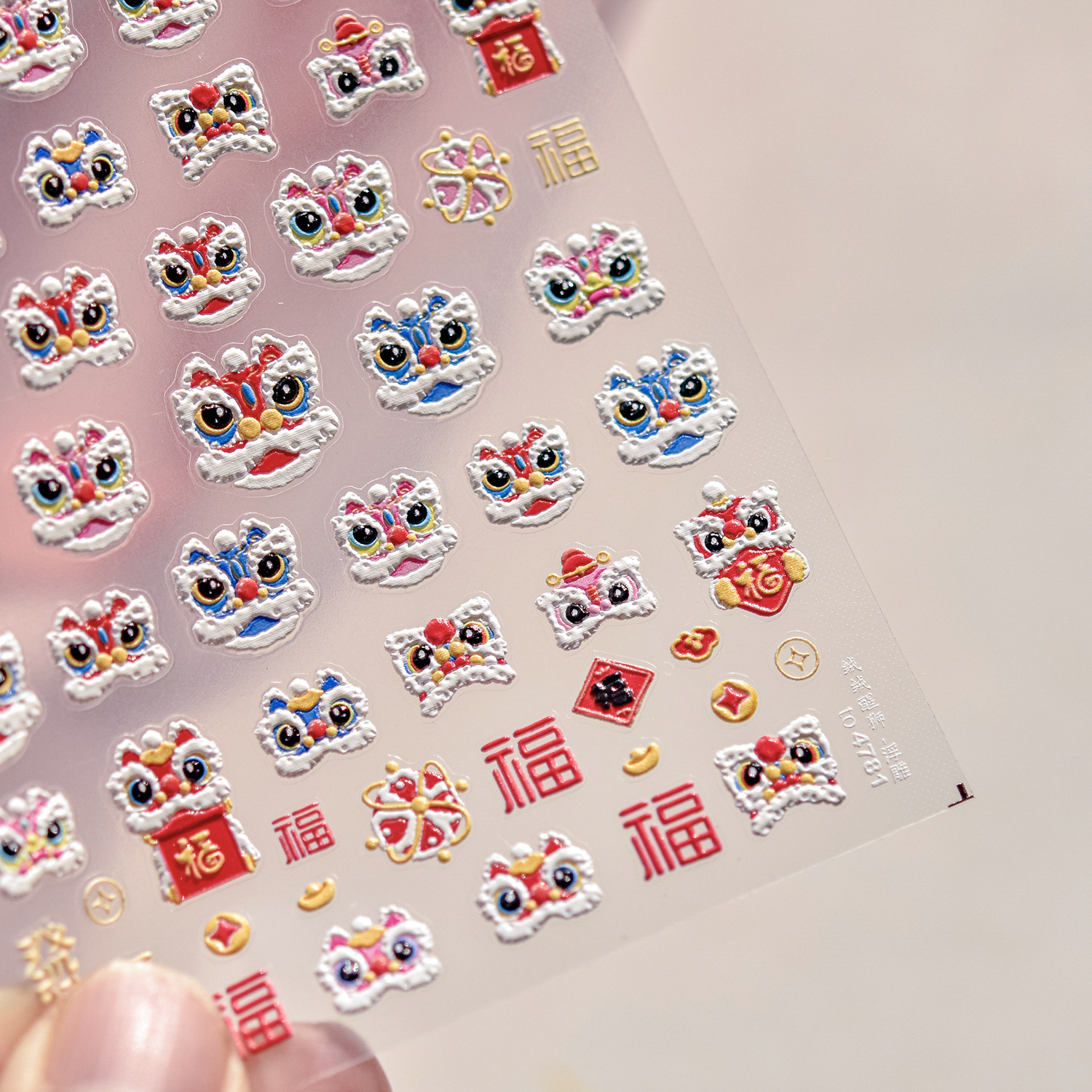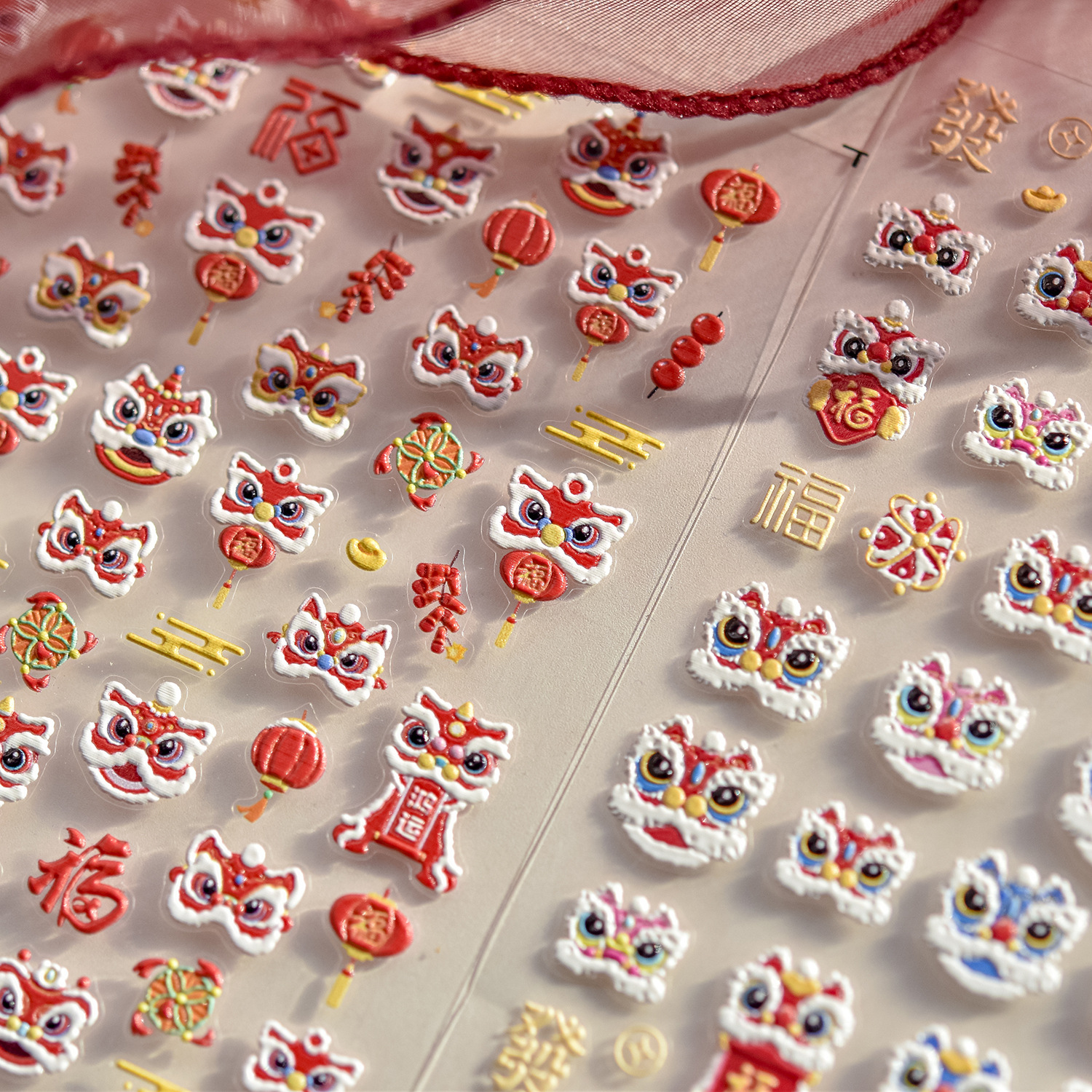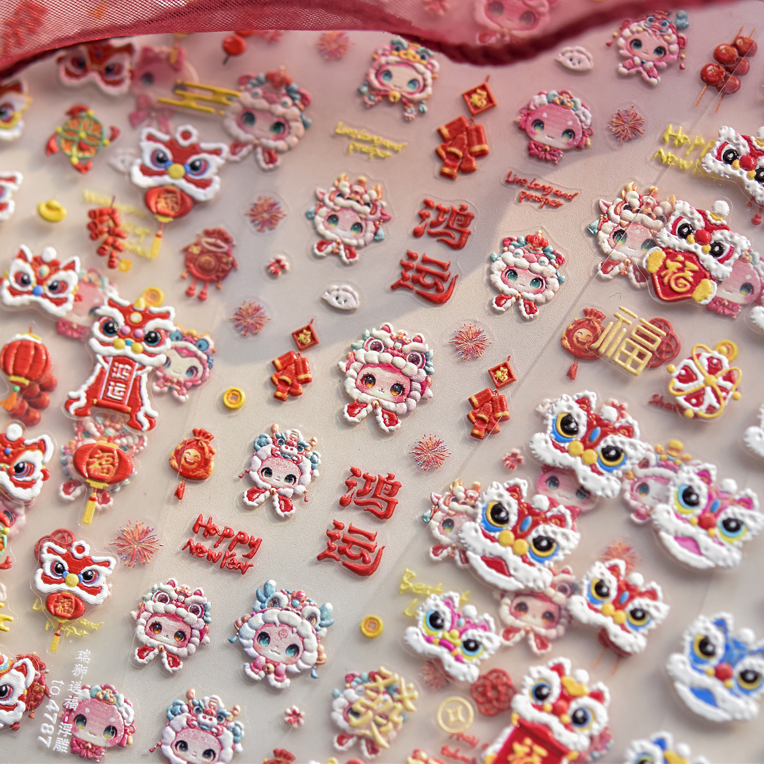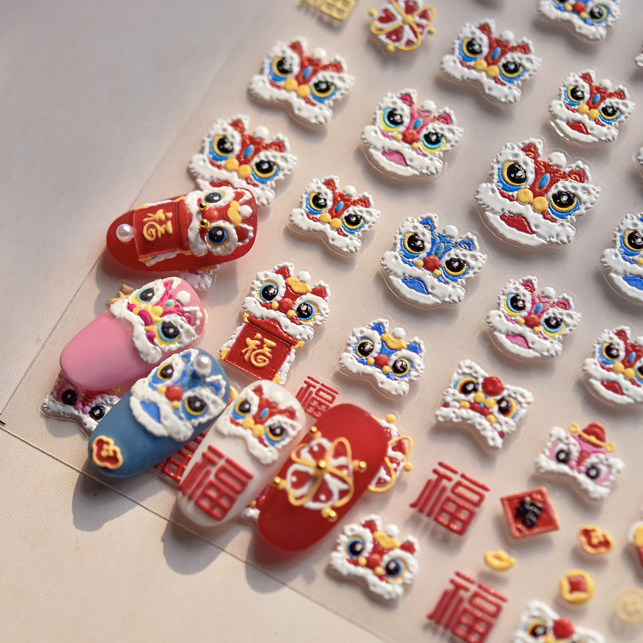 tomoni浮雕美甲贴纸爆款喜庆风国潮风指甲贴新年醒狮饰品贴纸素材
