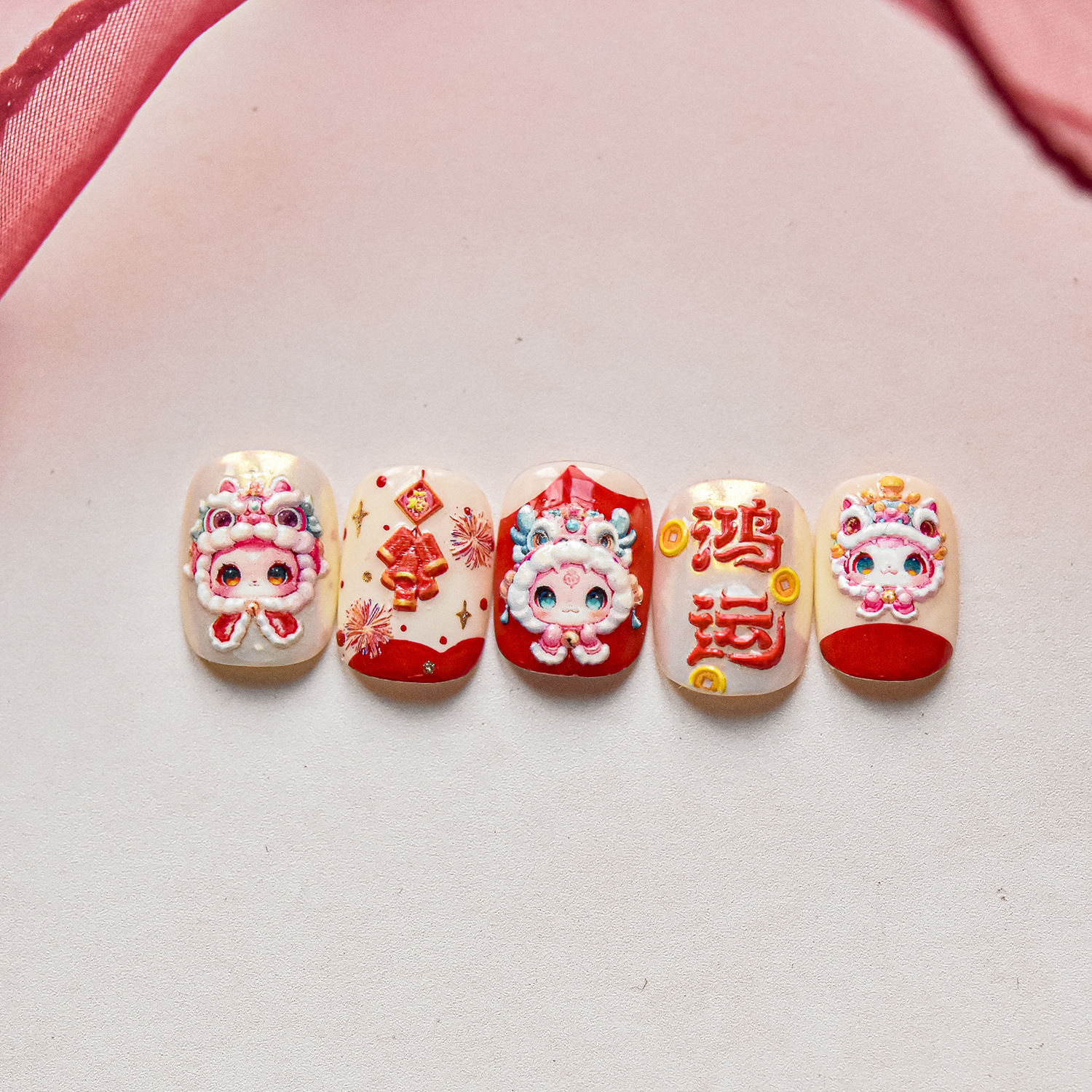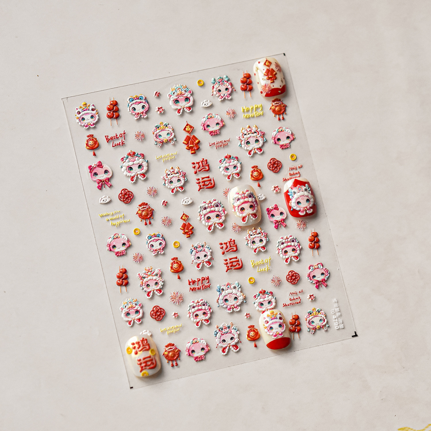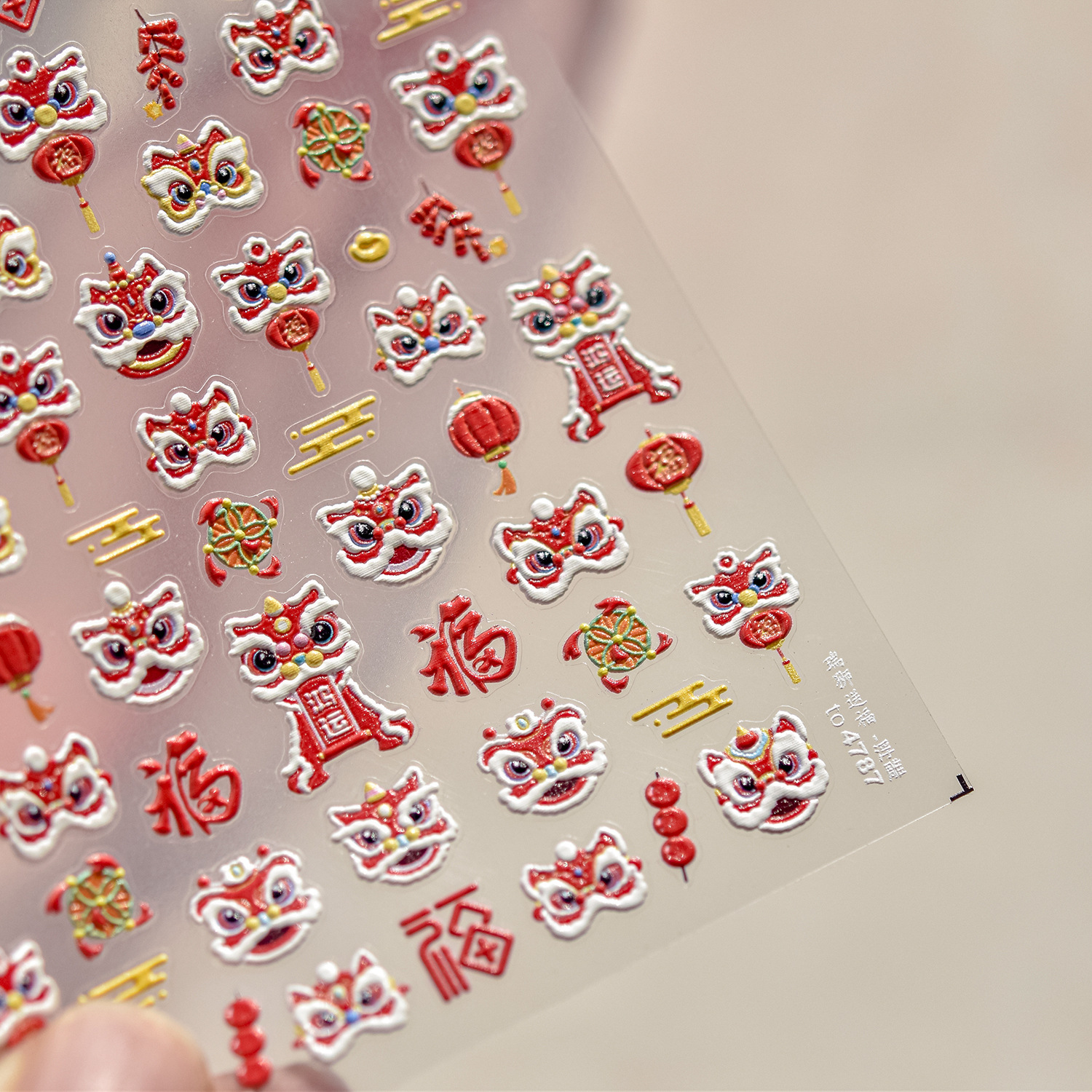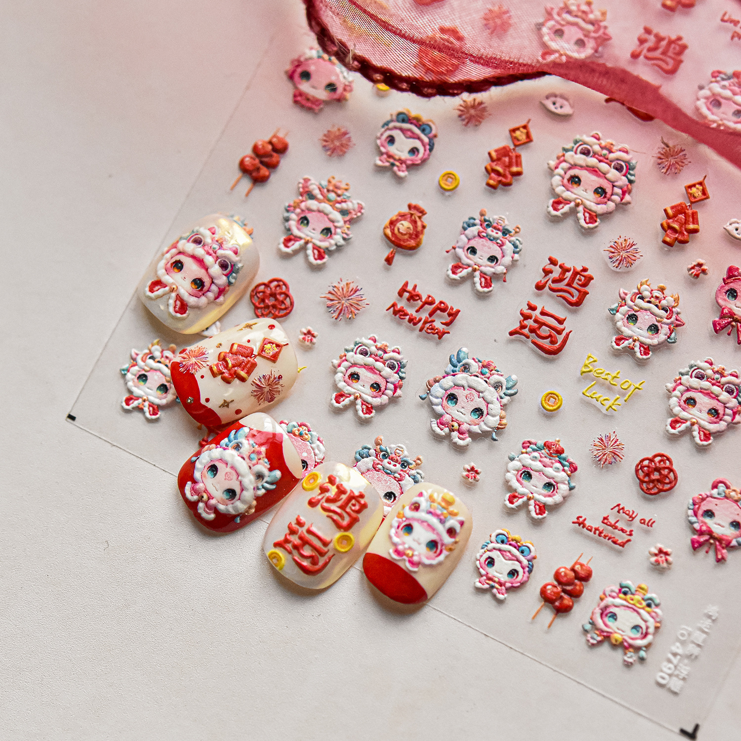 tomoni浮雕美甲贴纸爆款喜庆风国潮风指甲贴新年醒狮饰品贴纸素材