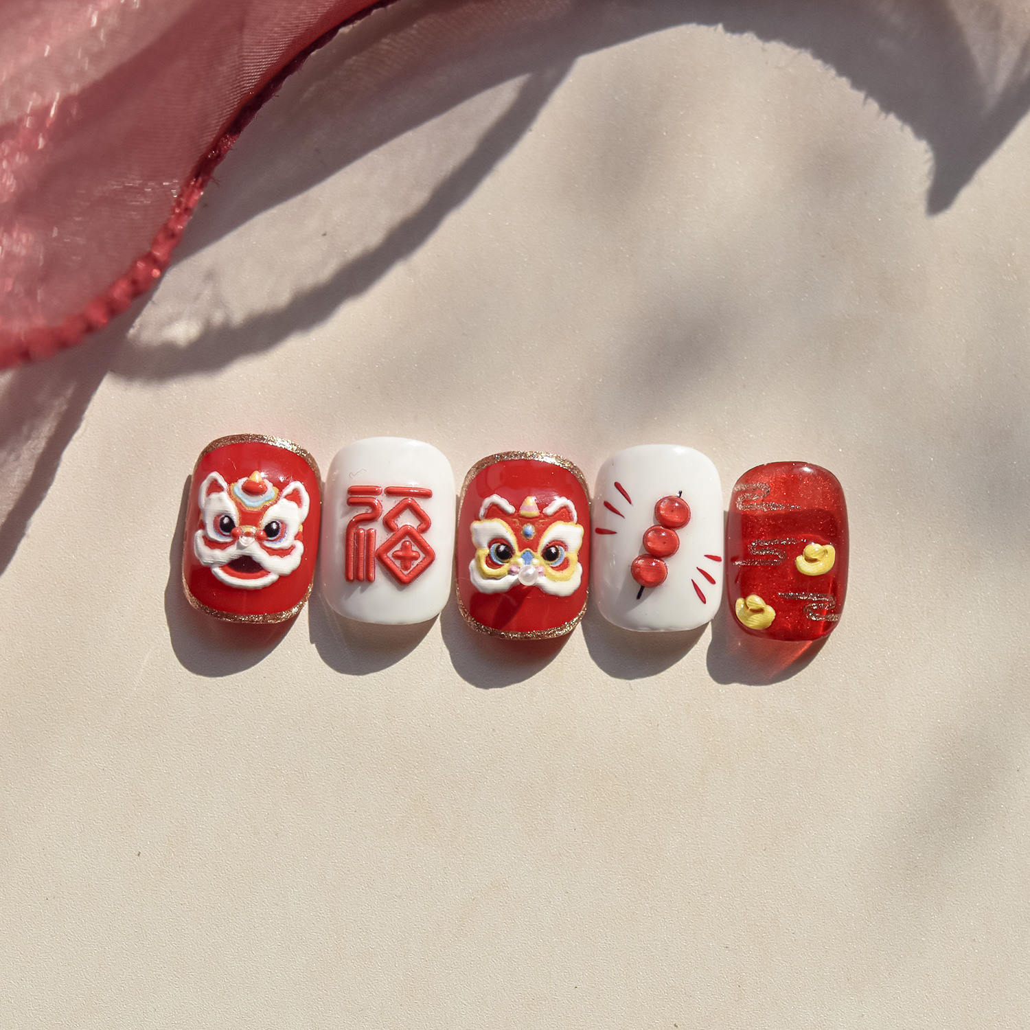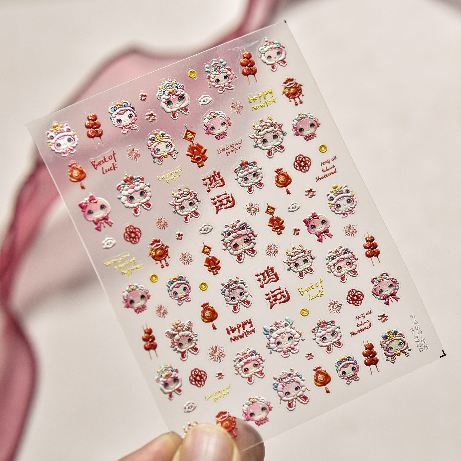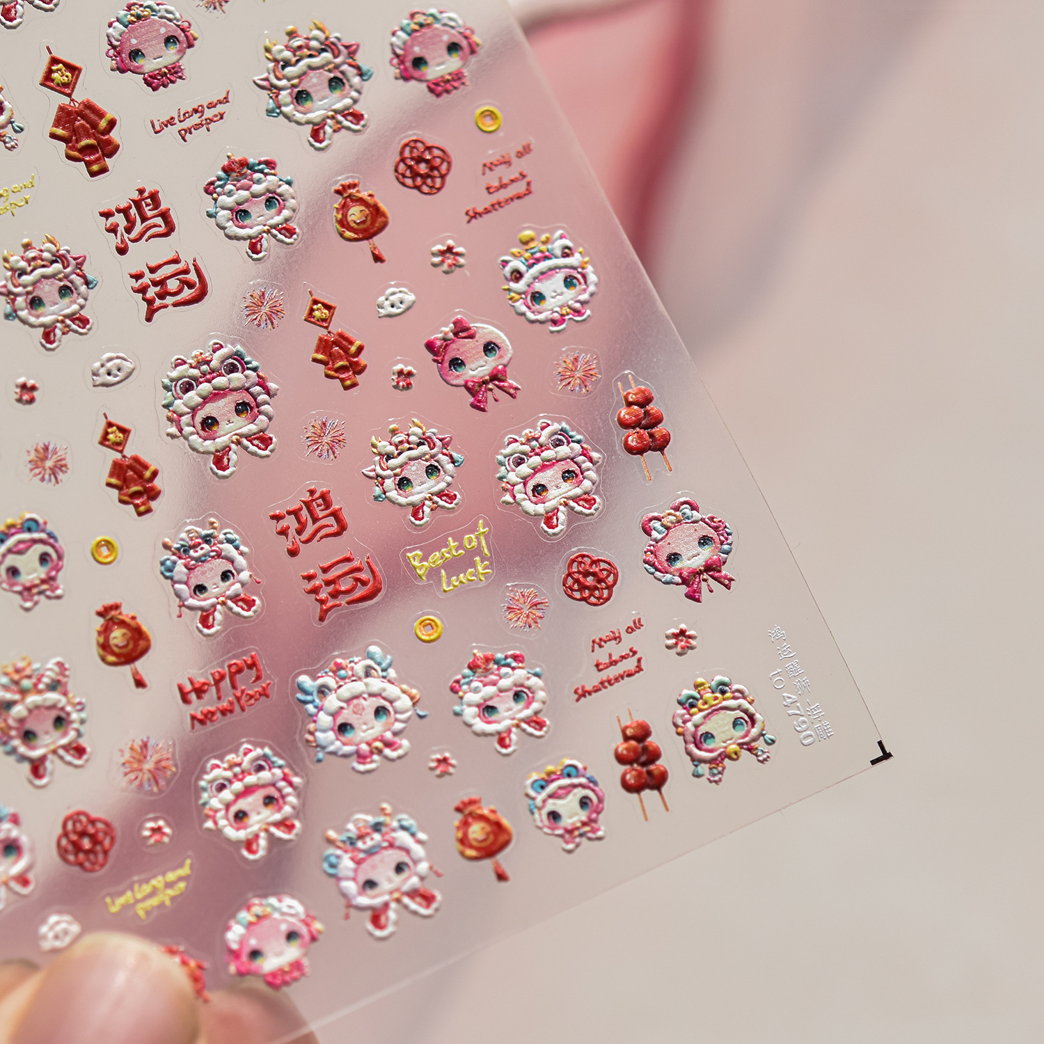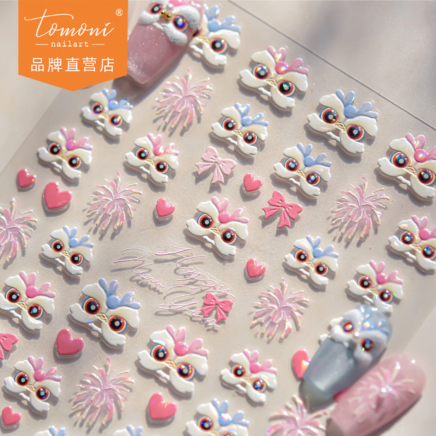 tomoni闪粉美甲贴纸小红书爆款可爱新中式指甲贴醒狮头套贴纸素材