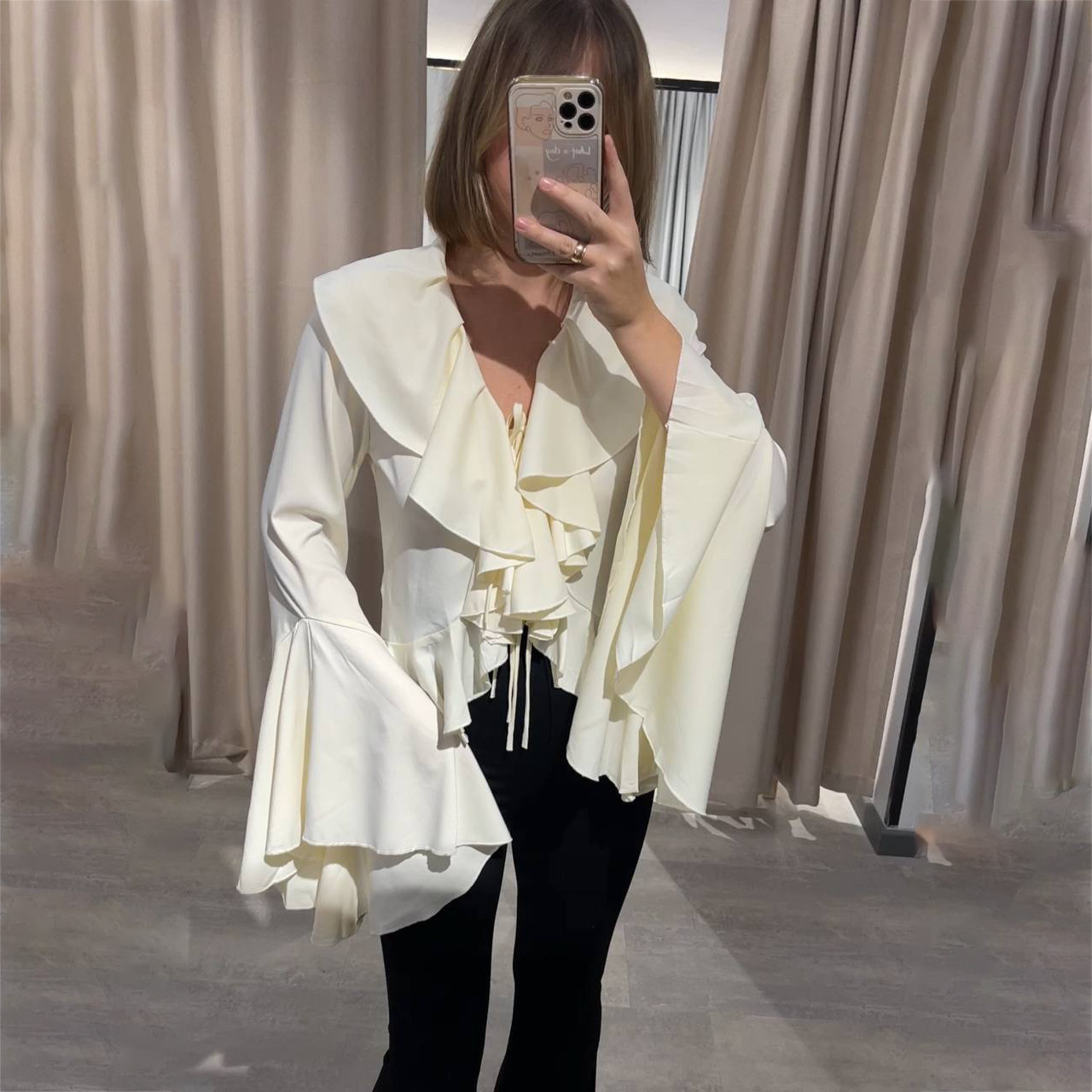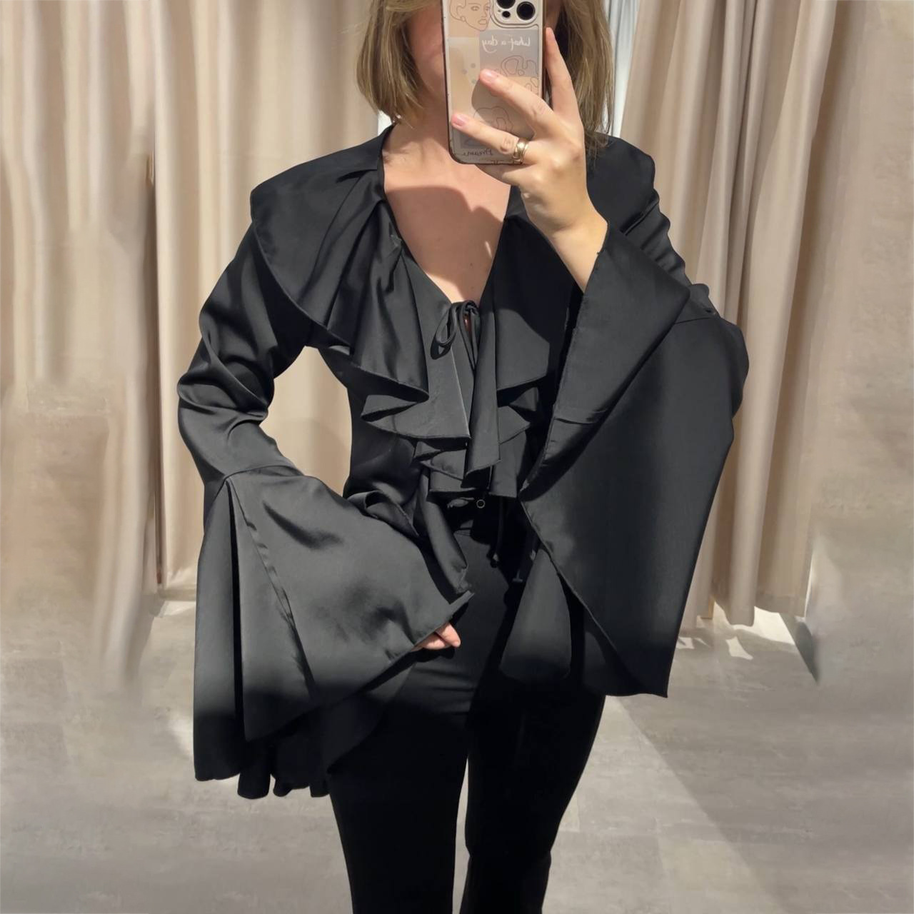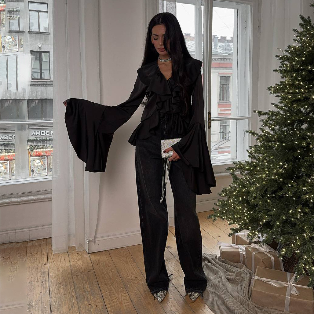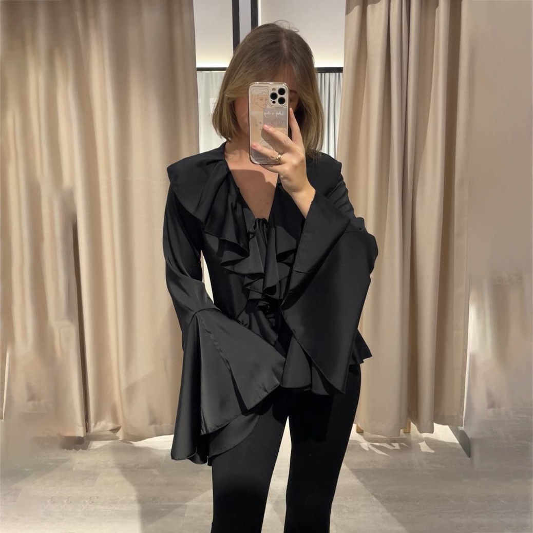 法式2025年春季新款缎面荷叶喇叭袖女式衬衫系带白衬衫高级感优雅
