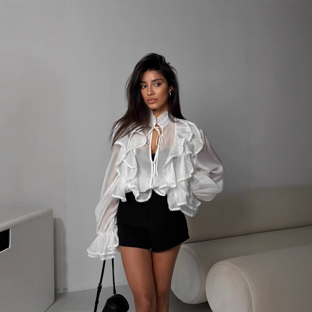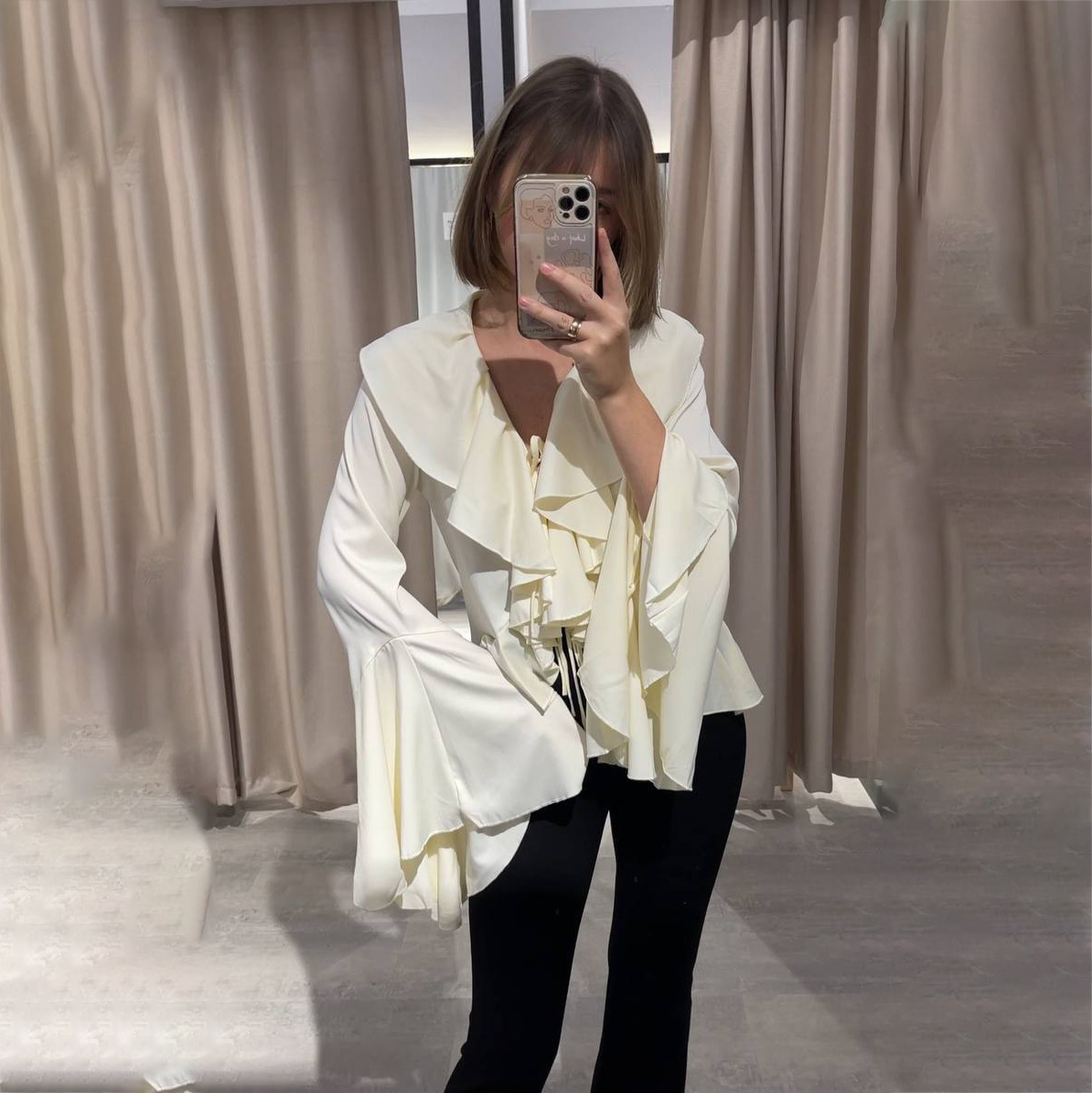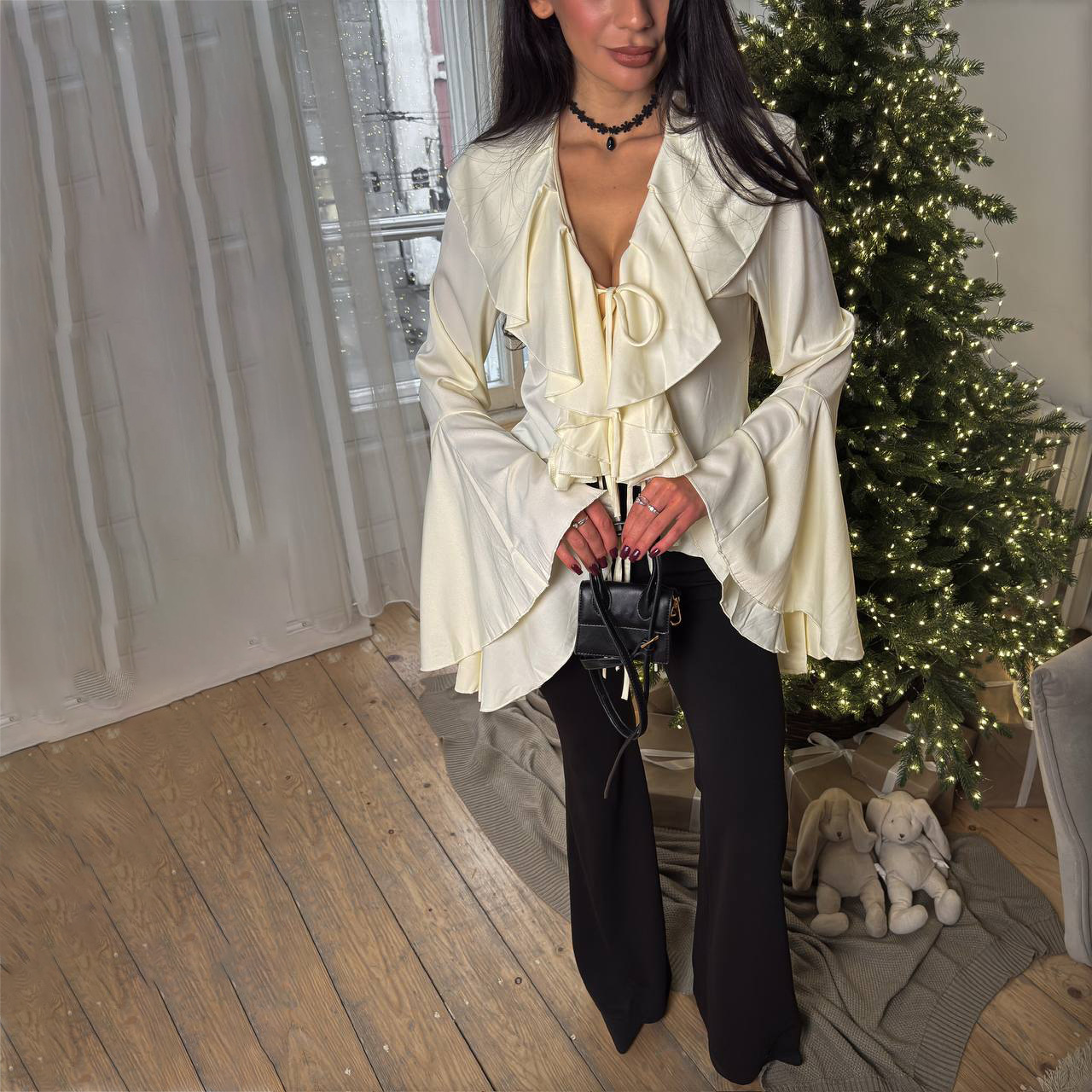 法式2025年春季新款缎面荷叶喇叭袖女式衬衫系带白衬衫高级感优雅