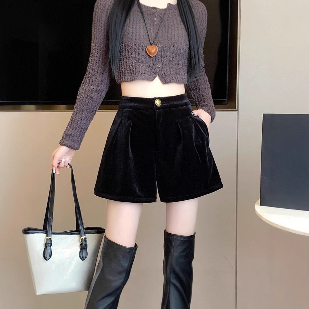 金丝绒黑色短裤女秋冬2025新款加绒小个子宽松高腰a字外穿靴裤潮