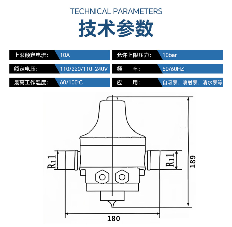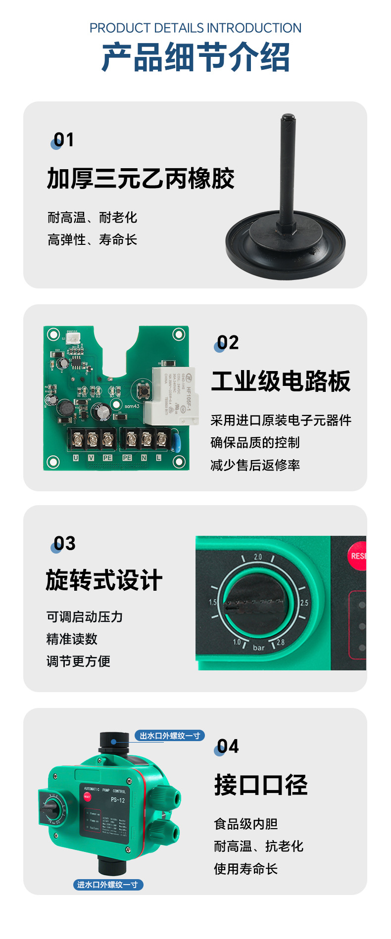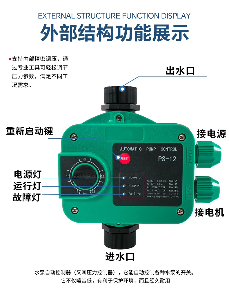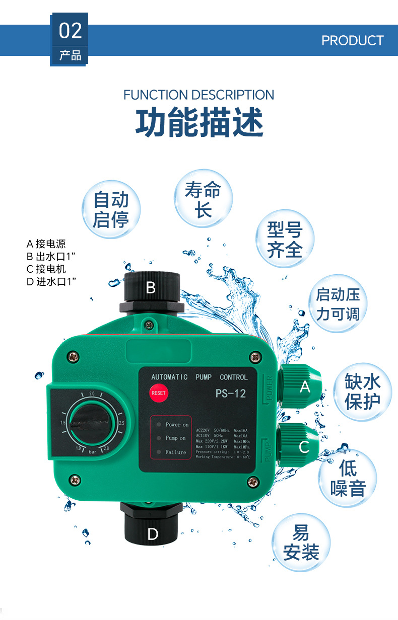 高出力ポンプ圧力制御スイッチ、インテリジェント自動起動・停止、多電圧対応水圧制御装置、越境