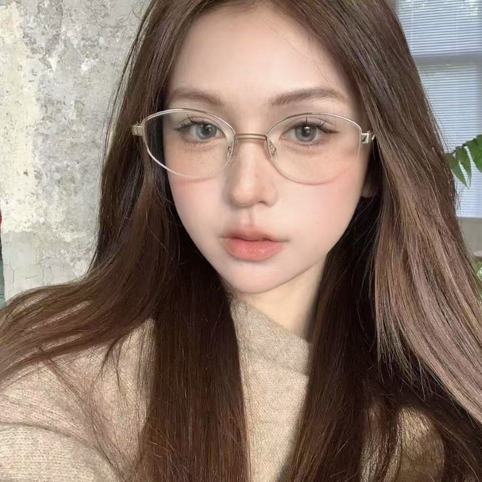 純粋な欲望スタイルの楕円形ハーフフレームメタルフラットミラー、四角顔と丸顔の女性向け、ハイエンドフレーム、近視防止ブルーライトメガネを装備可能