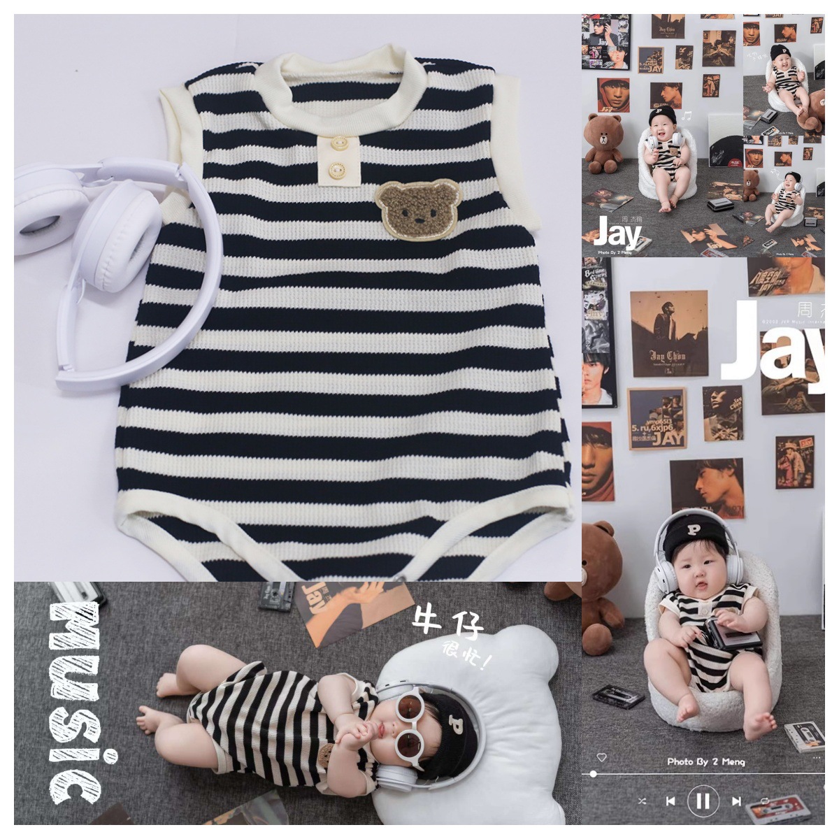 ベビー服夏の新しいスタイルノースリーブハーレムスタイル幼児ジャンプスーツストライプクマバッグおなら服薄い夏