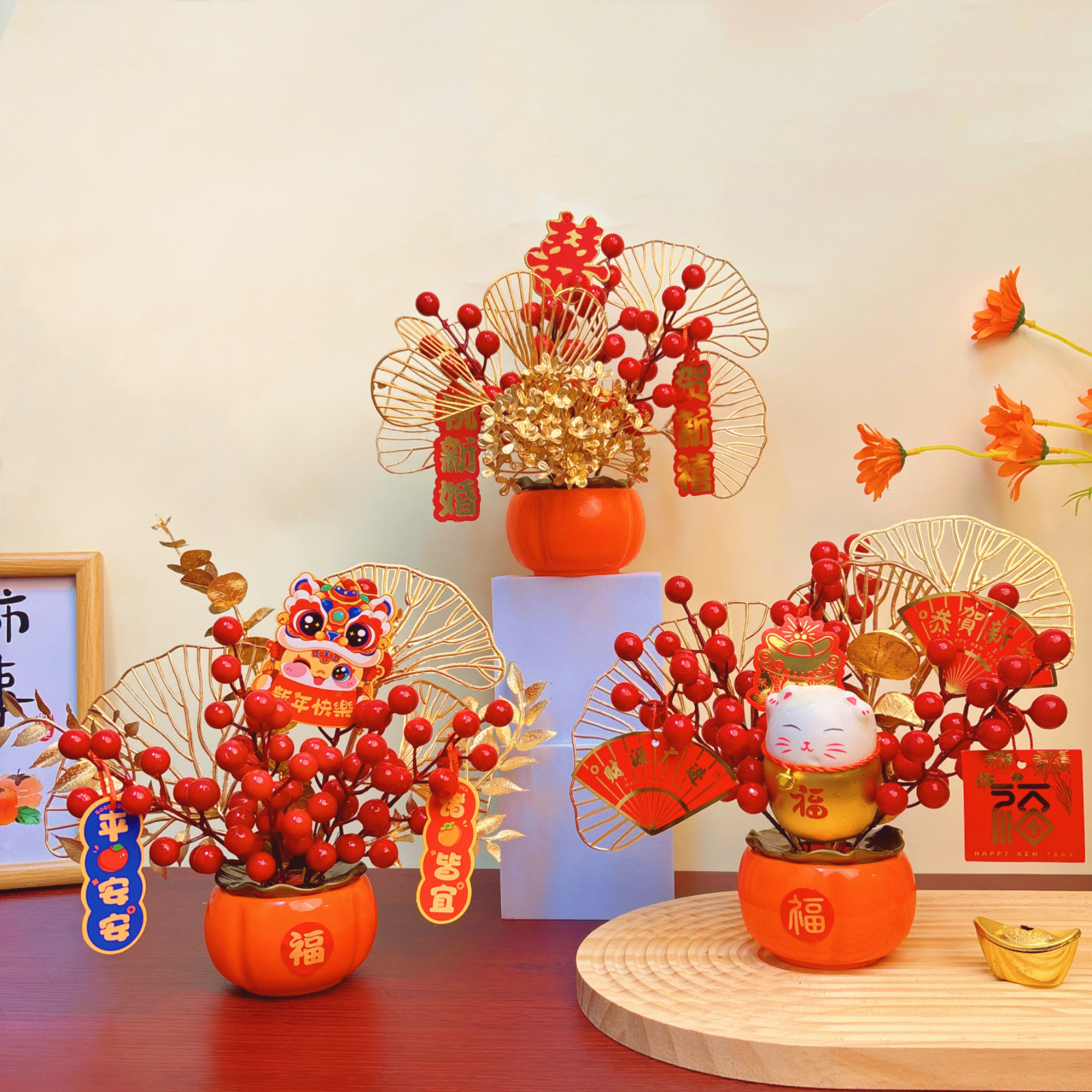 お祝いの福の果物飾り、模造紅柿、福桶、蛇年、結婚式、リビングルームの装飾、ギフト、結婚式用品