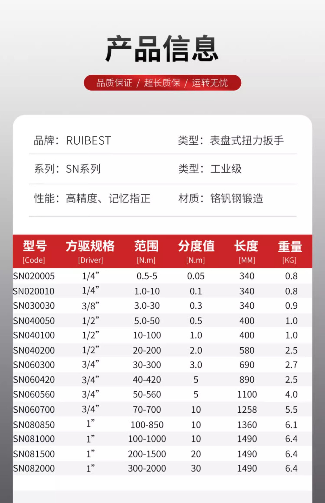 仕様とモデル SN020005角ドライブ1/4トルク0.5~5Nm,SN020010角ドライブ1/4トルク1-10Nm,SN030030角ドライブ 3/8 トルク 3-30Nm,SN040050角ドライブ1/2トルク5-50Nm,SN 040100 角ドライブ1/2トルク 10-100Nm,SN040200角ドライブ1/2トルク20-200Nm,SN060300角ドライブ3/4トルク 30-300Nm,SN060420角ドライブ3/4トルク 40-420Nm,SN060560角ドライブ3/4トルク 50-560Nm,SN060700角ドライブ3/4トルク 70-700Nm,SN080850角ドライブ1トルク 100-850Nm,SN081000角ドライブ1トルク 100-1000Nm,SN081500角ドライブ1トルク 200-1500Nm,SN082000角ドライブ1トルク 300-2000Nm
