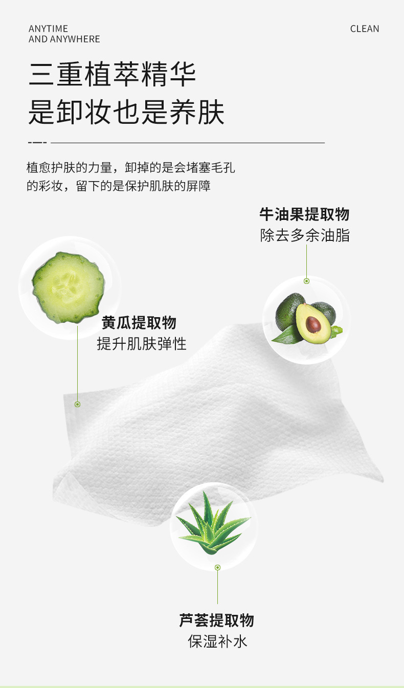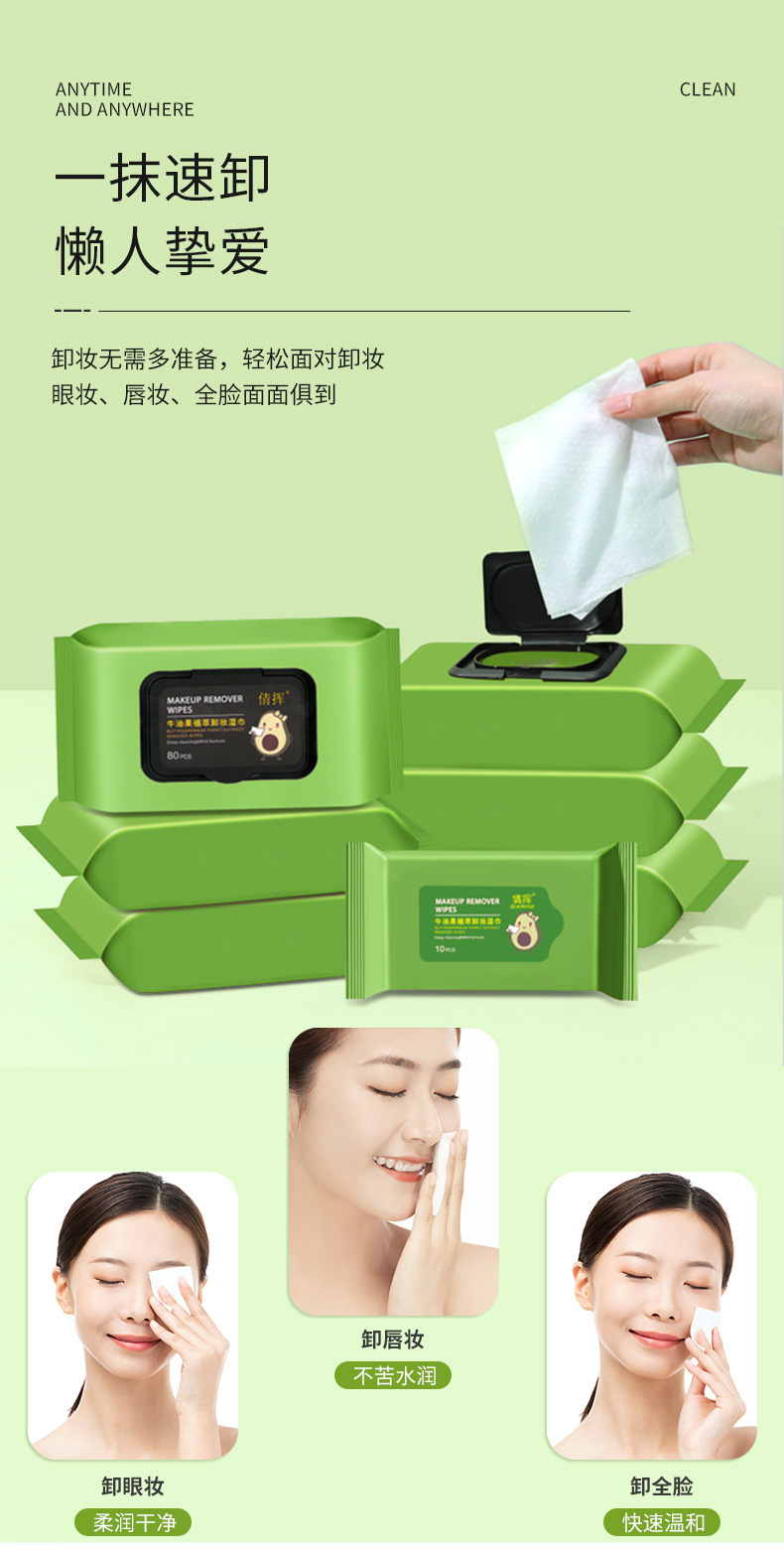牛油果卸妆湿巾60片一次性湿纸巾面部温和清洁卸妆巾便携式洁面巾