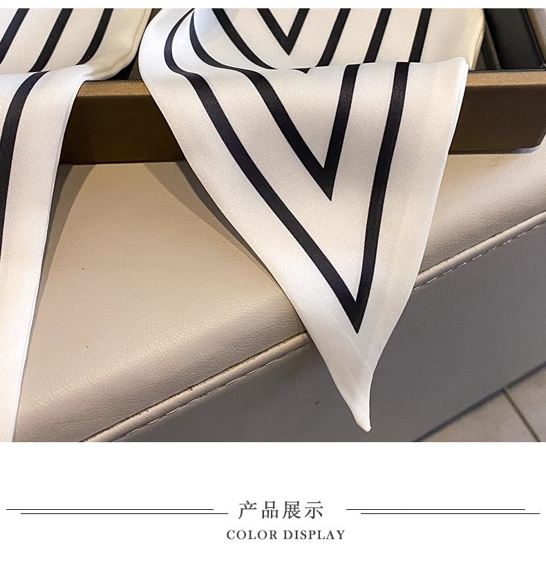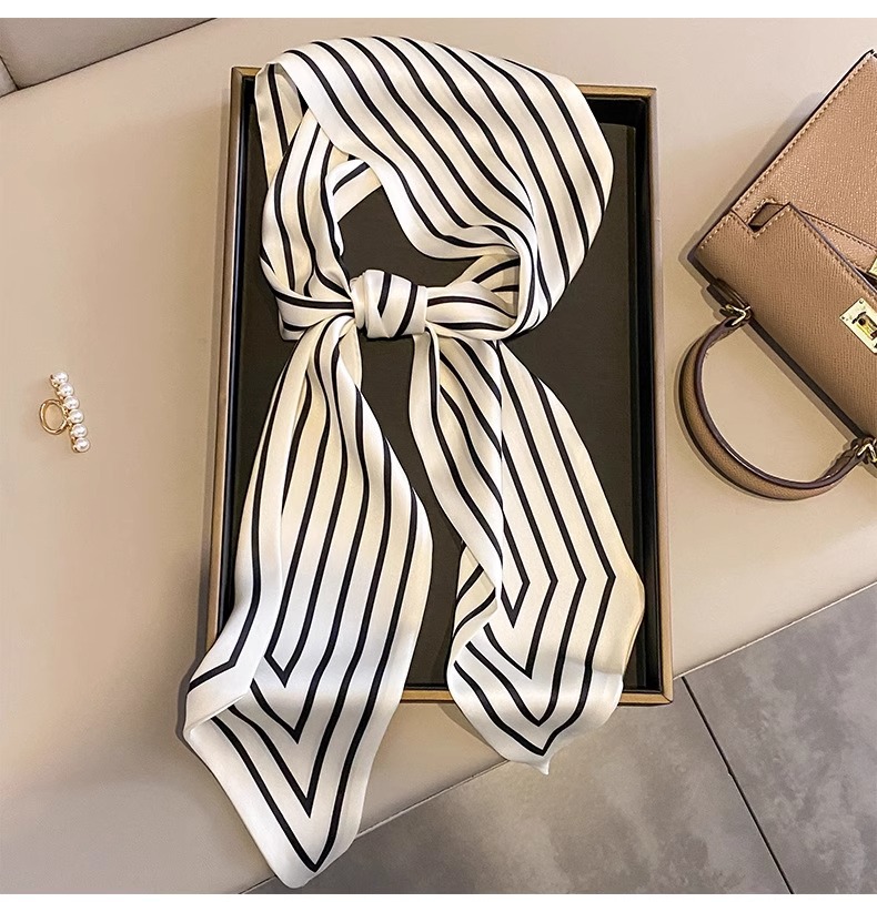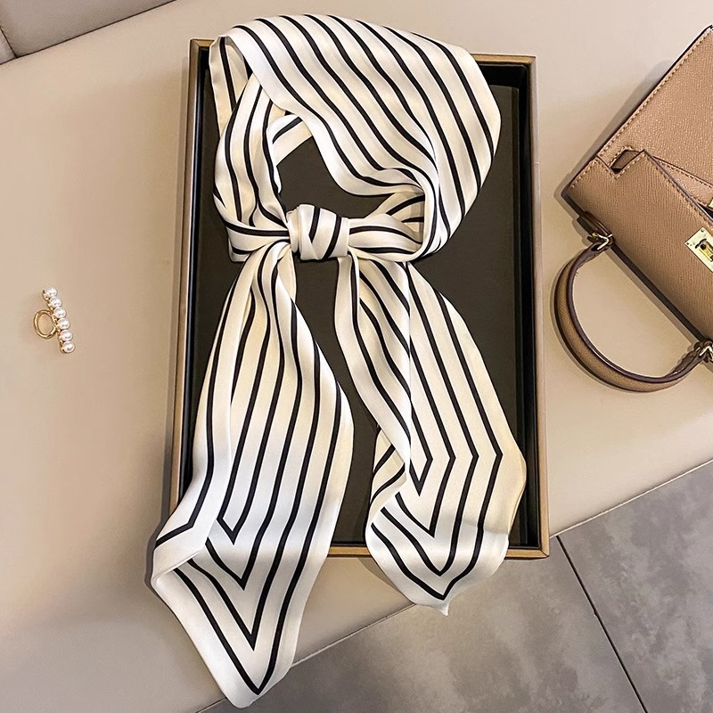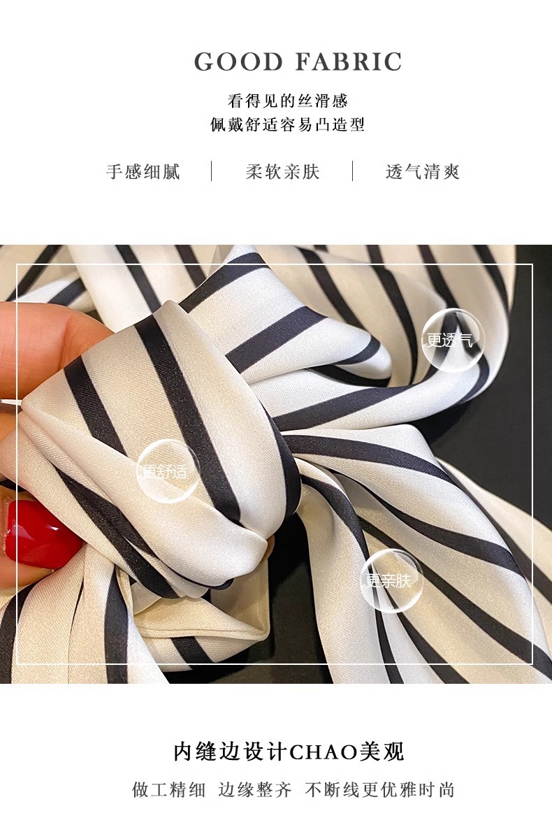 韓国系の長いストライプの白黒の波点のシルクタオルの春夏の新型の首のスカーフの装飾の百合の気質はシャツのリボンを組み合わせます。