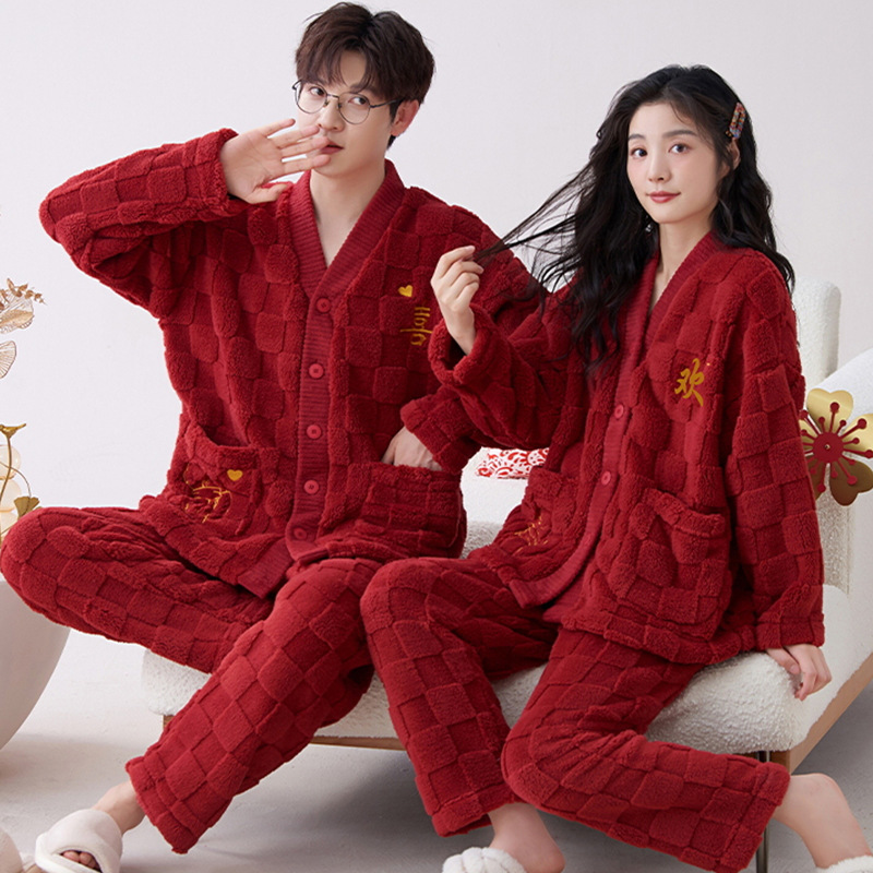 パジャマ結婚新婚カップルセット赤いコーラルフリース男性女性モデル厚いベルベットカップルパジャマ秋冬モデル