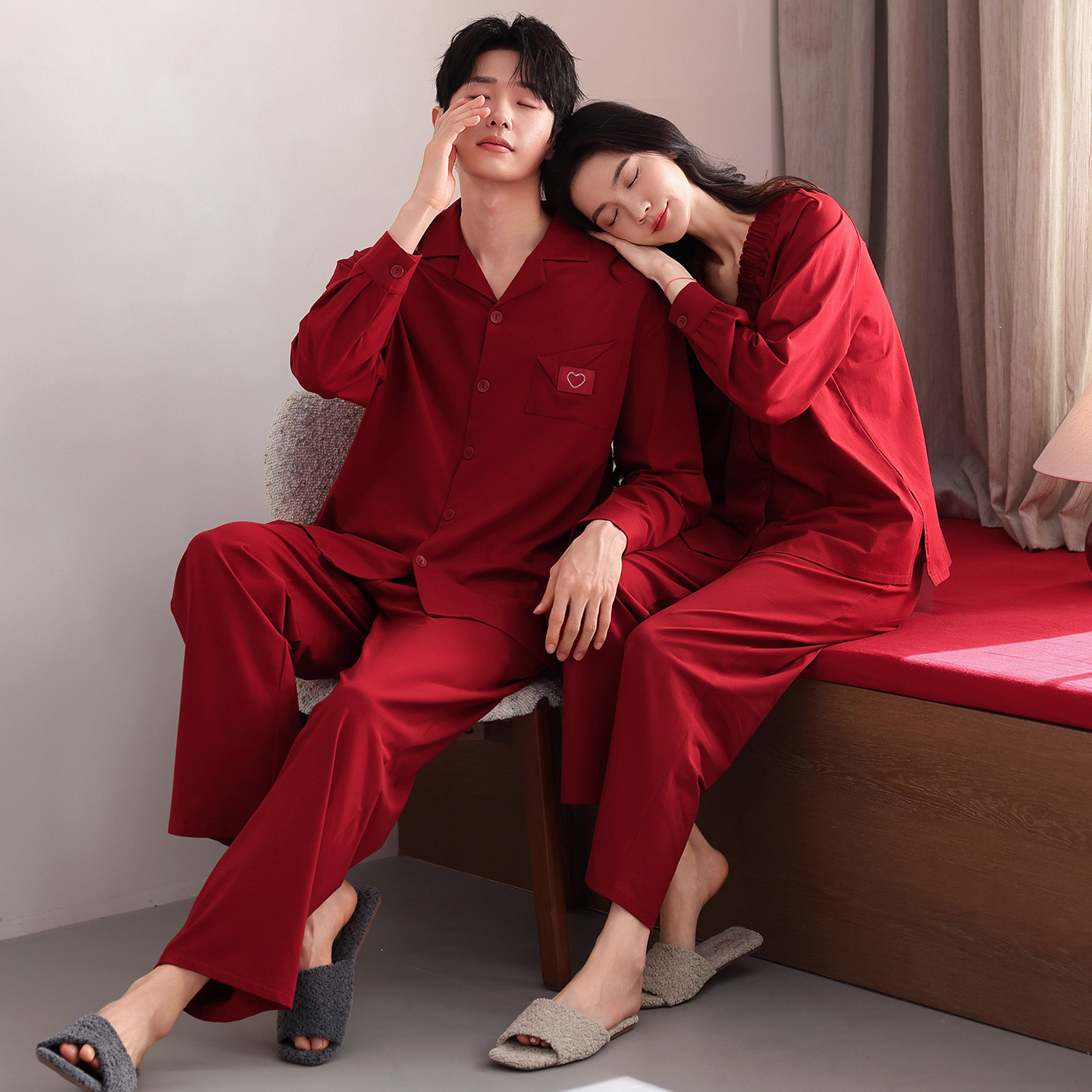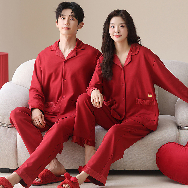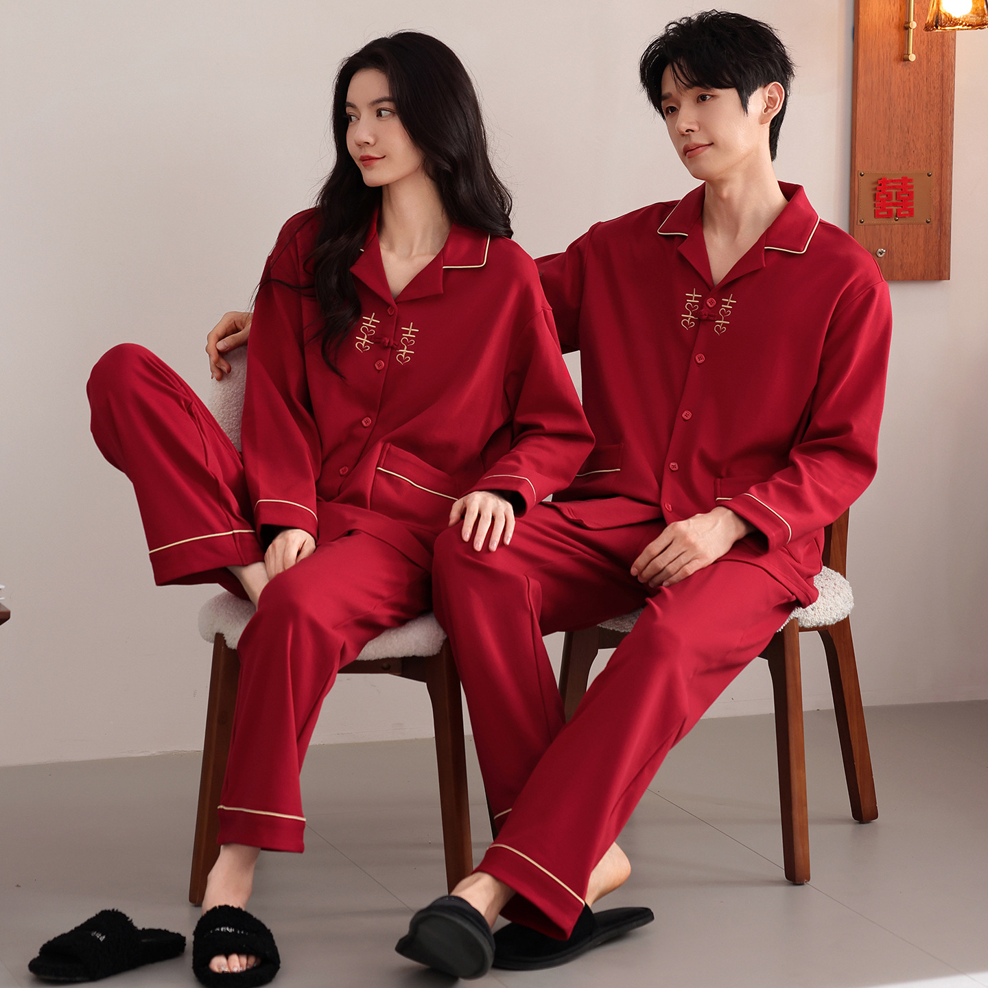 カップル純綿パジャマ大赤色新婚結婚本命年春秋長袖ズボン女性本命ホームウェアセット