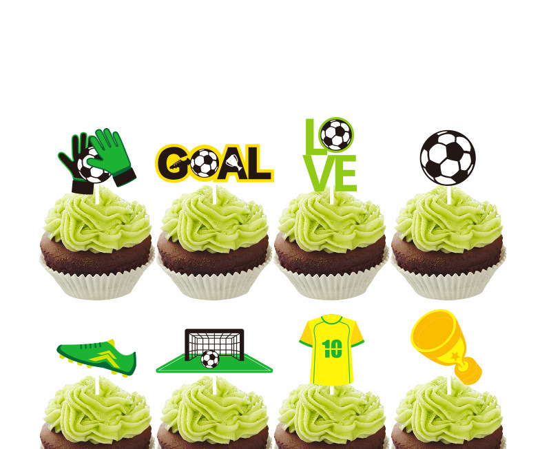 国境を越えたスポーツのテーマサッカーのワールドカップのパーティーのケーキは札の小さいケーキの杯を挿します。
