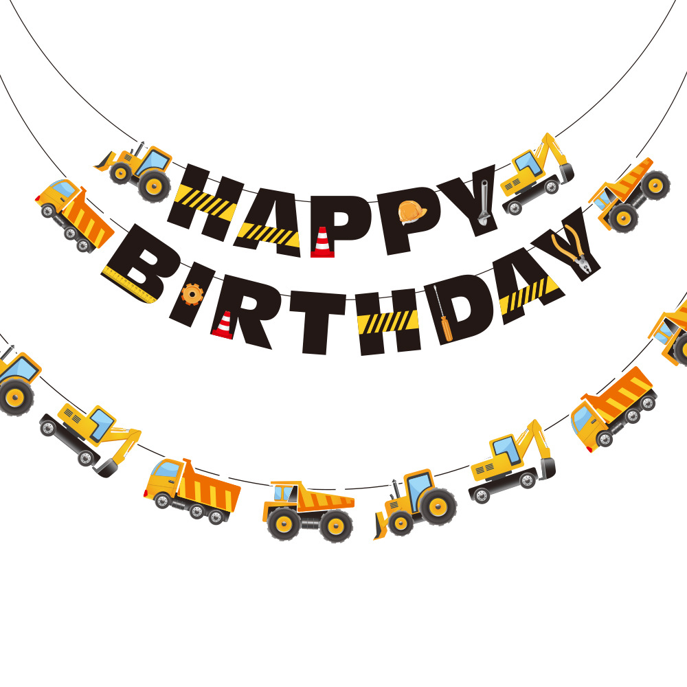 新しい工事車の子供の誕生日のパーティーは旗の漫画の掘削機の誕生日を引っ張ります。