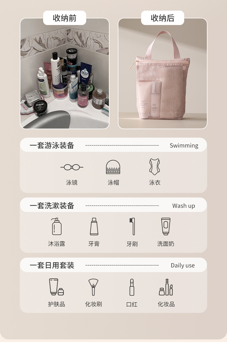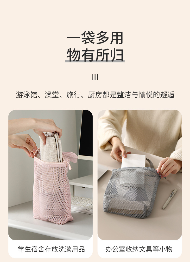 FaSoLa旅行洗漱包游泳便携式外出网格化妆收纳袋网眼透明小包网纱
