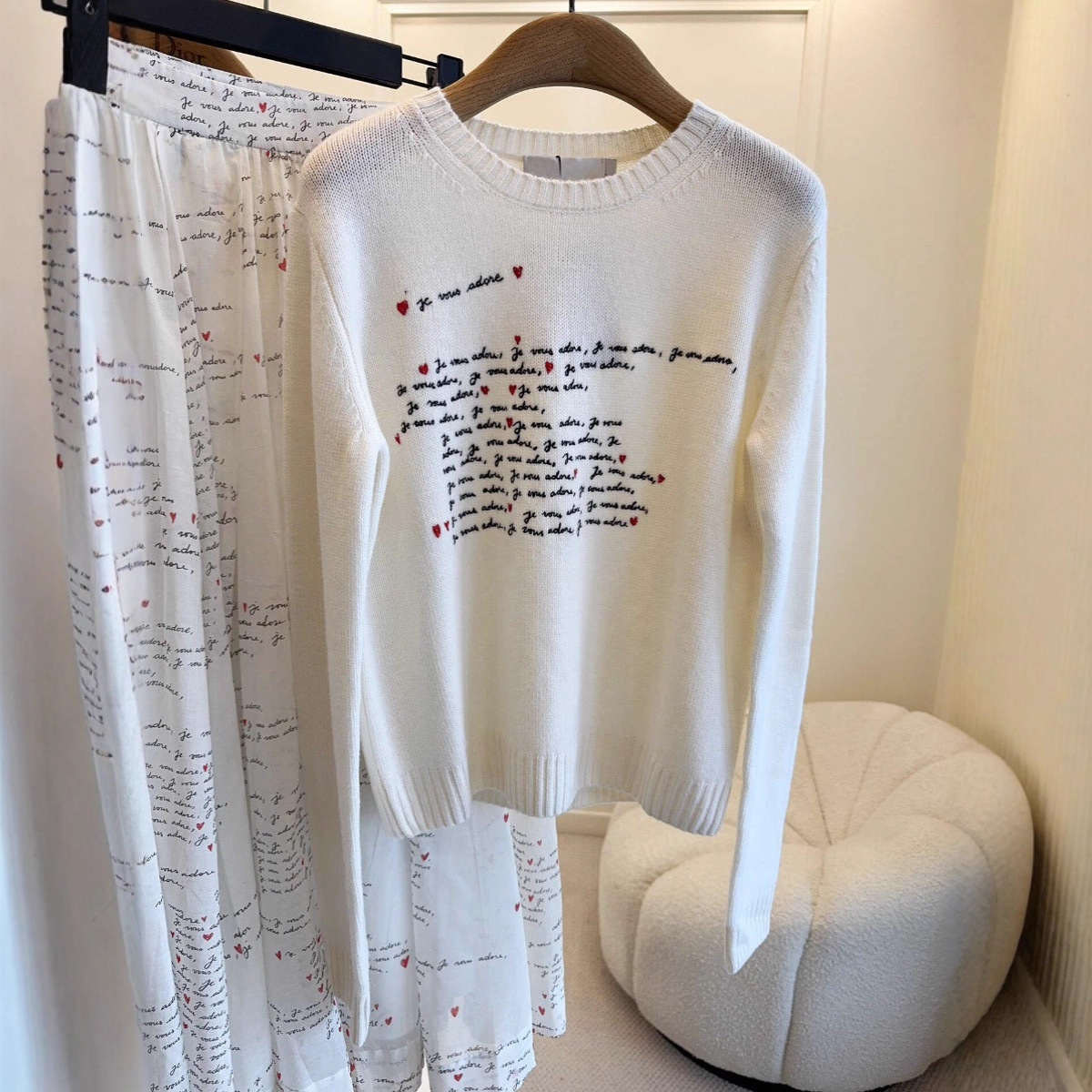 现货D家2025气质优雅减龄爱心字母刺绣山羊绒百搭显瘦长袖毛衣女