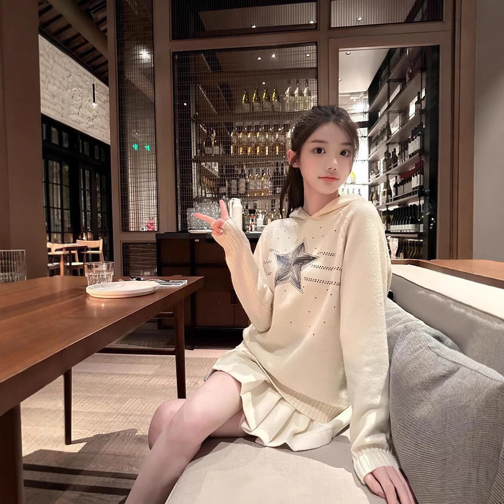 在庫あり Dブランド 2025秋冬モデル 胸元星刺繍ロゴ ラインストーン付き ウール製 プルオーバー フード付きセーター レディース