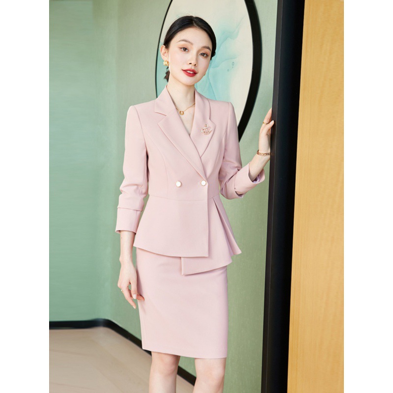 粉色西装套装女职业套裙美容院工作服正式场合艺考播音主持人正装