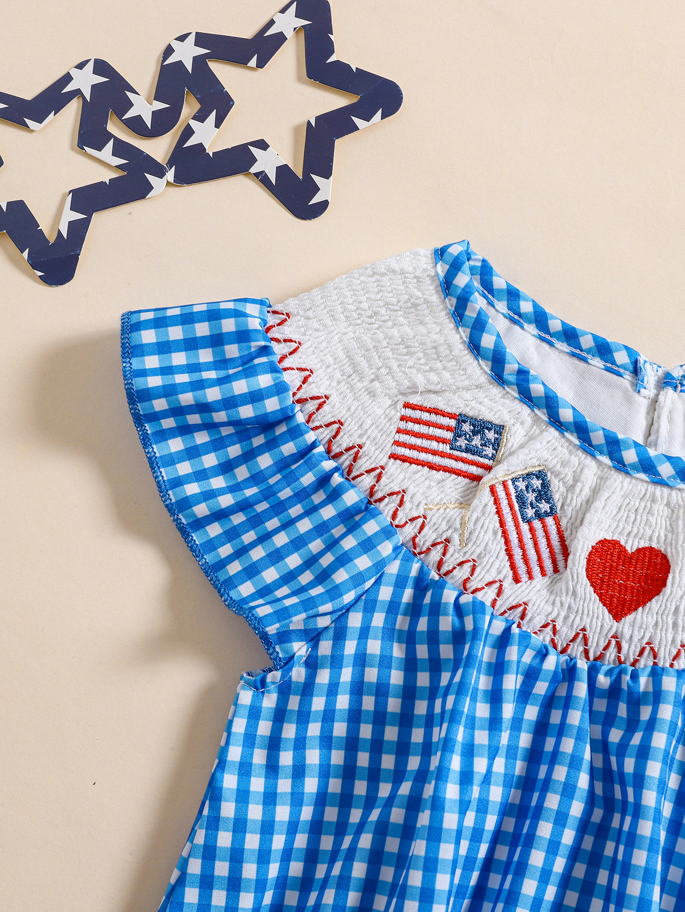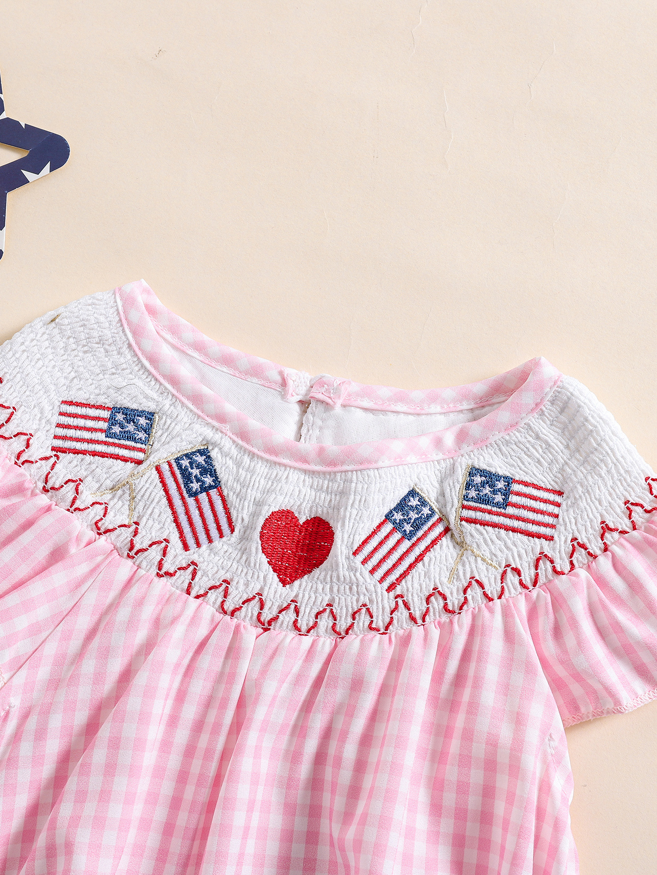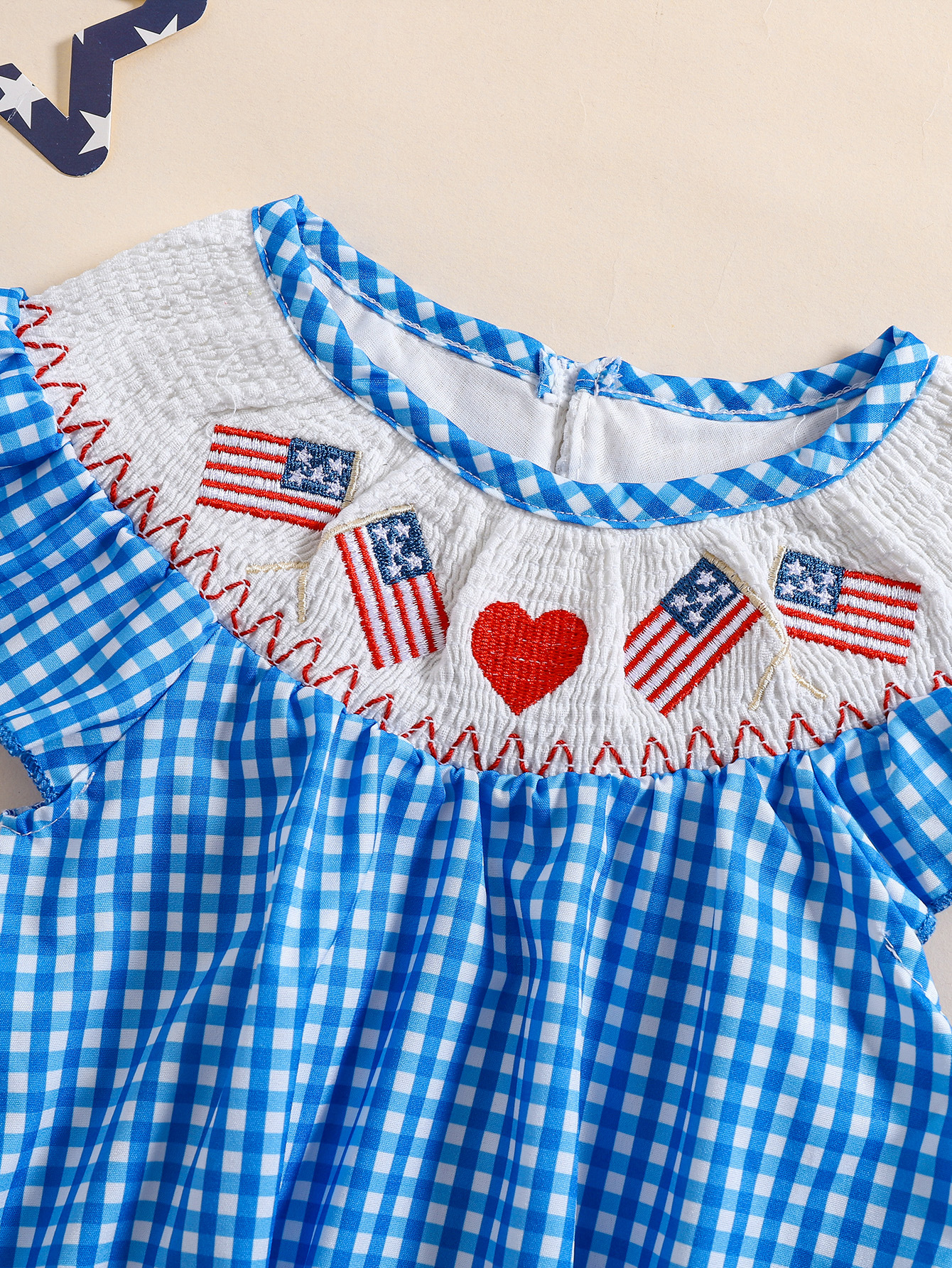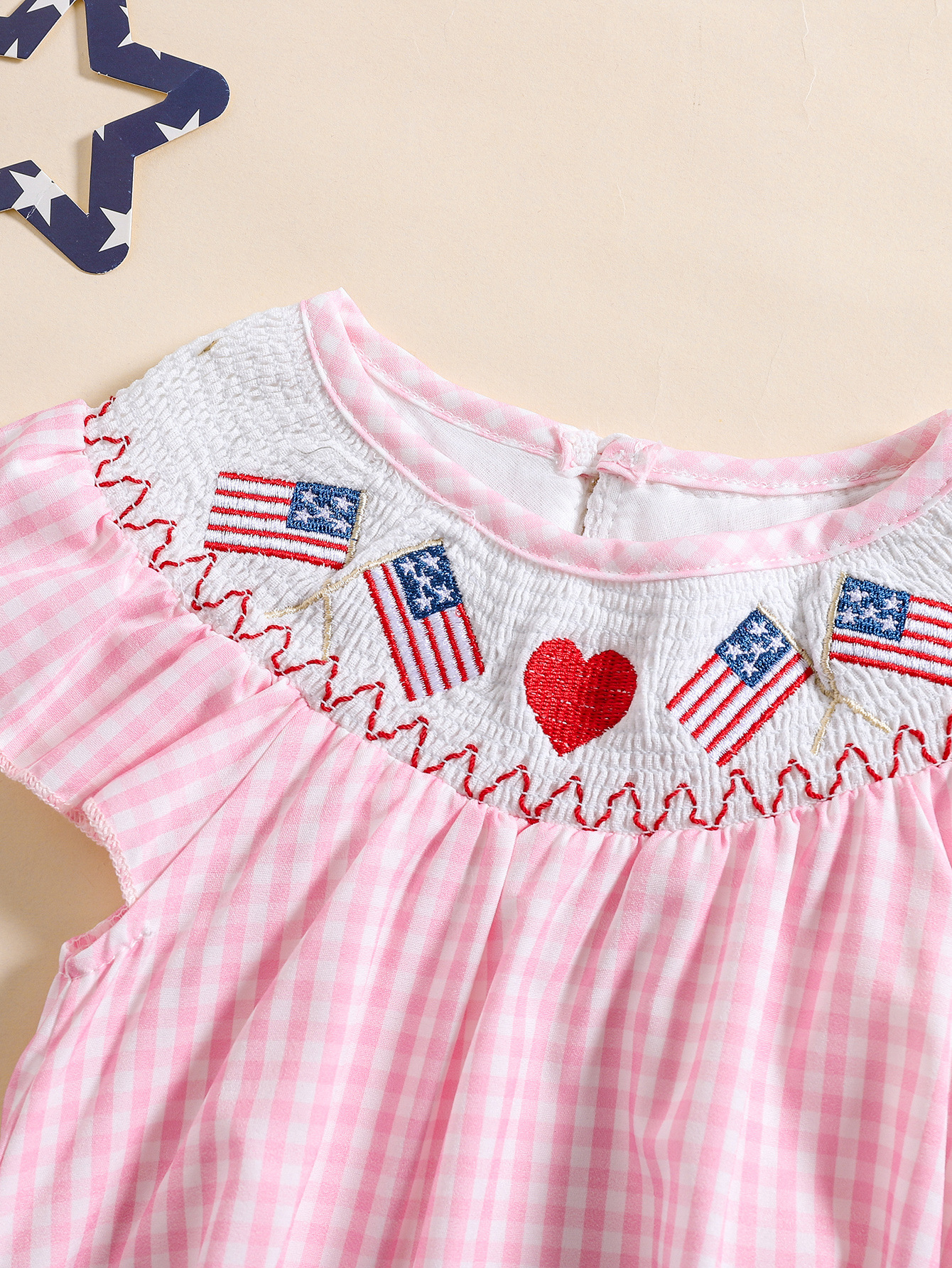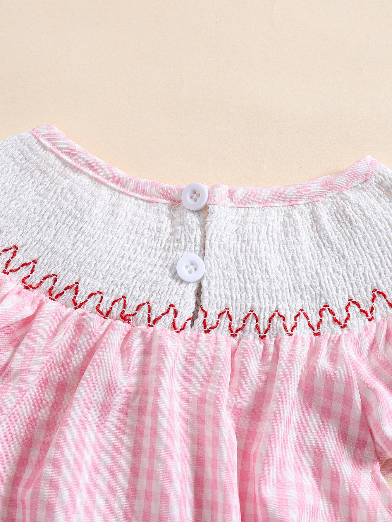 女の赤ちゃんのワンピースの夏の新型のバレンタインデーの格子の王女のスカートの刺繍の図案の泡の袖は服を登ります。