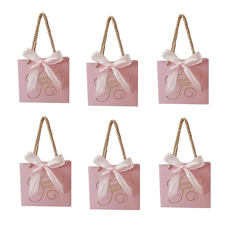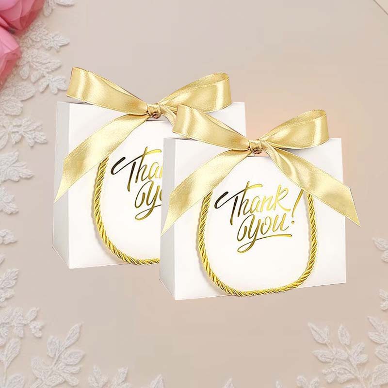 越境結婚式のお菓子ギフトバッグ、蝶結び付きピンクと白の箔押し紙箱、角底バッグ