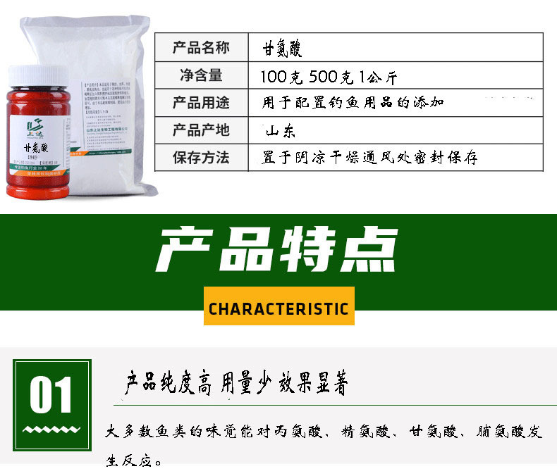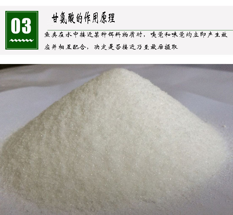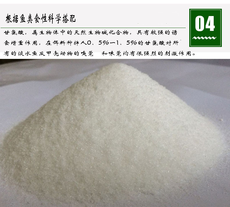 【产品介绍】白色结晶或结晶性粉末,用明胶水解经分离制成,甜味型氨基酸。易溶于水,不溶于乙醇和乙醚。对几乎所有的海、淡水鱼类和水产动物均具有强烈的诱食效果。