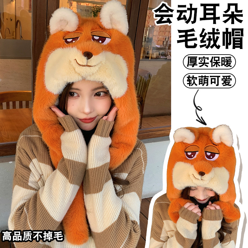 可爱卡通尼克狐狸毛绒帽子冬季加厚保暖防寒耳朵会动护耳帽雷锋帽
