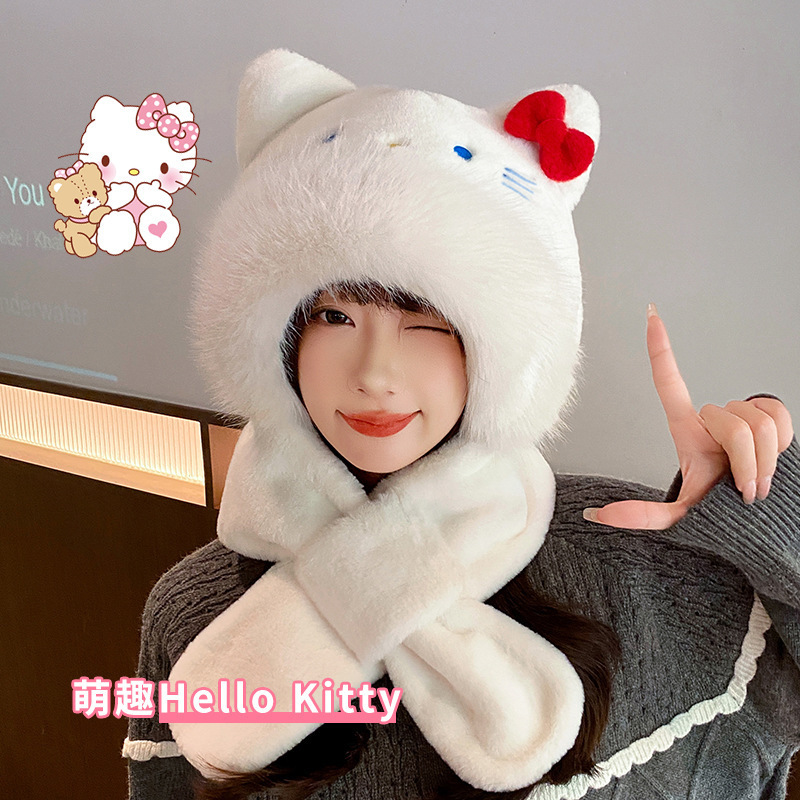 凯蒂猫帽子围巾手套一体女冬季保暖加厚围脖连帽三件套骑车防风
