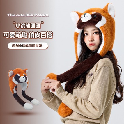 可爱卡通小浣熊帽子批发耳朵会动毛绒帽可爱熊猫新款保暖护耳帽