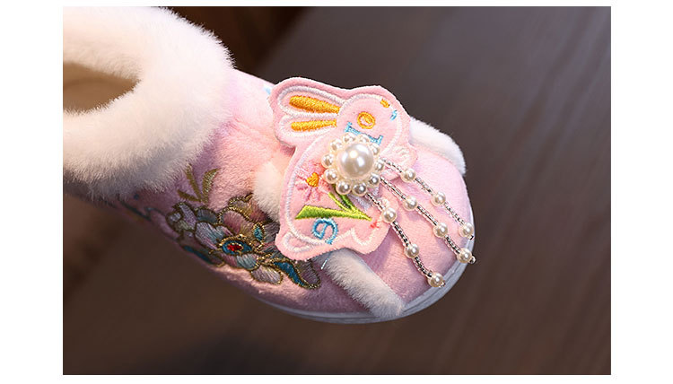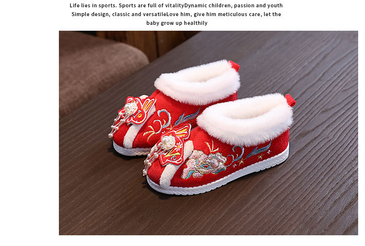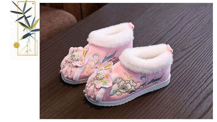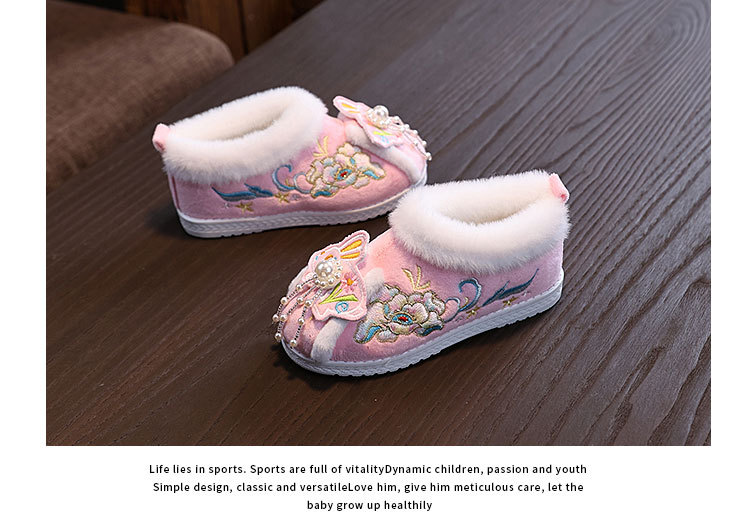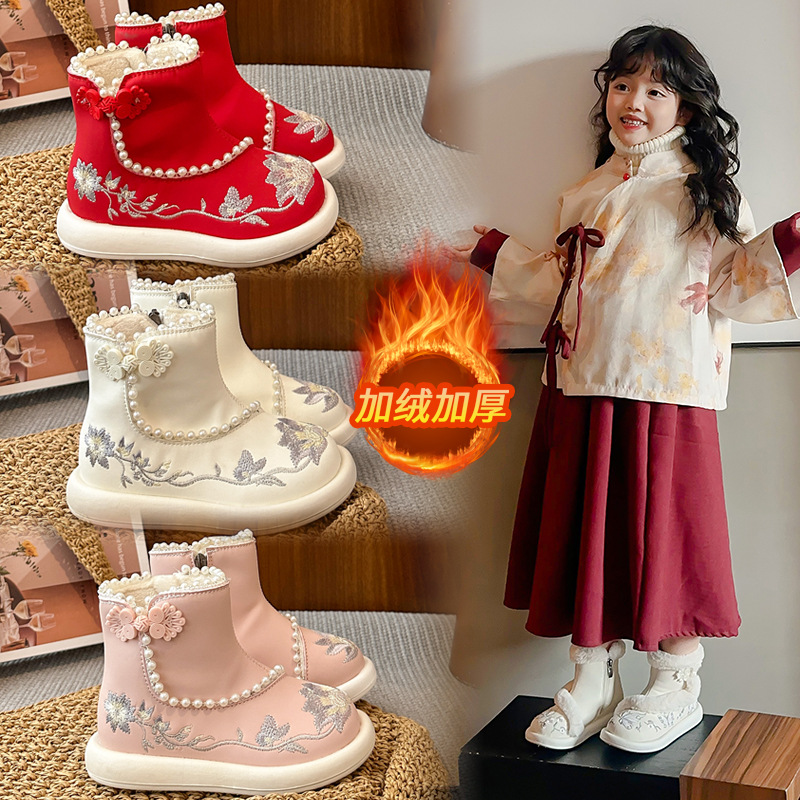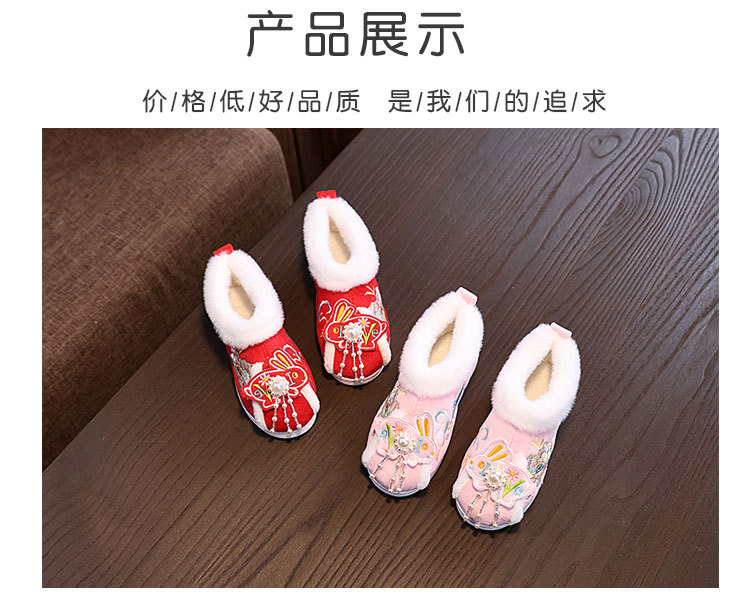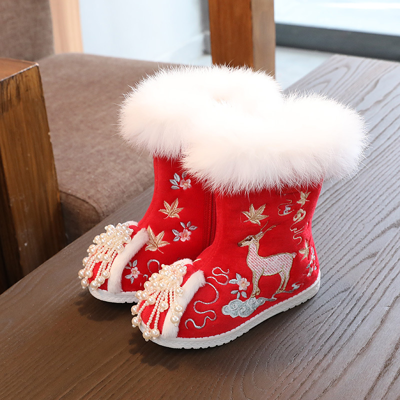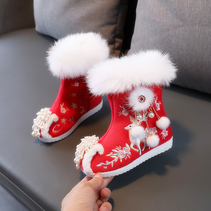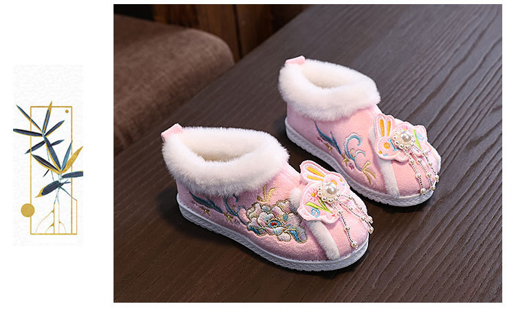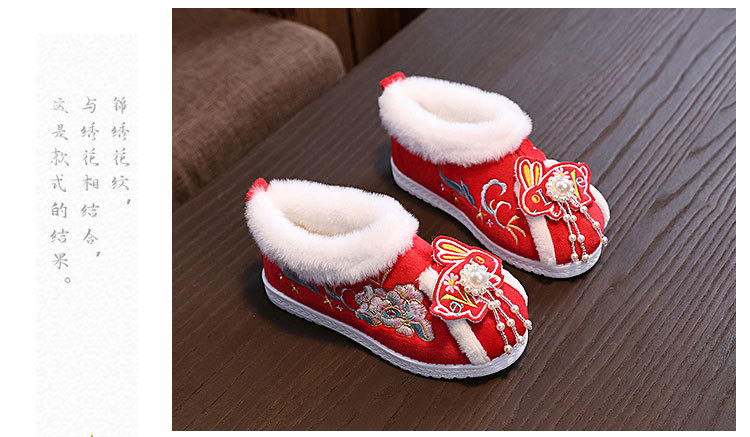 冬の新作子供用裏起毛厚手綿靴漢服靴ベビー綿ブーツ女の子中国風刺繍靴お年賀靴
