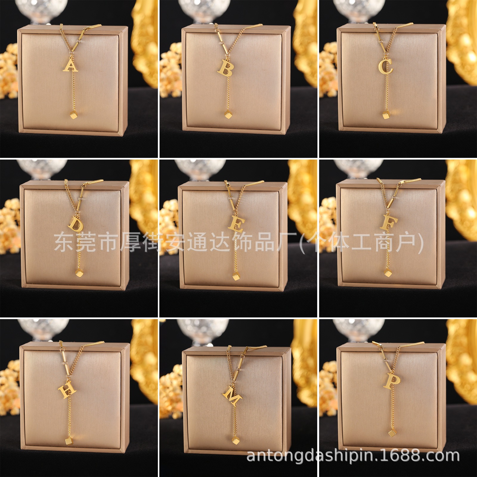 クロスボーダーヨーロッパとアメリカのステンレス鋼 26 文字ネックレス女性の小さな正方形タッセルペンダント鎖骨チェーンシンプルで多用途なセーターチェーン