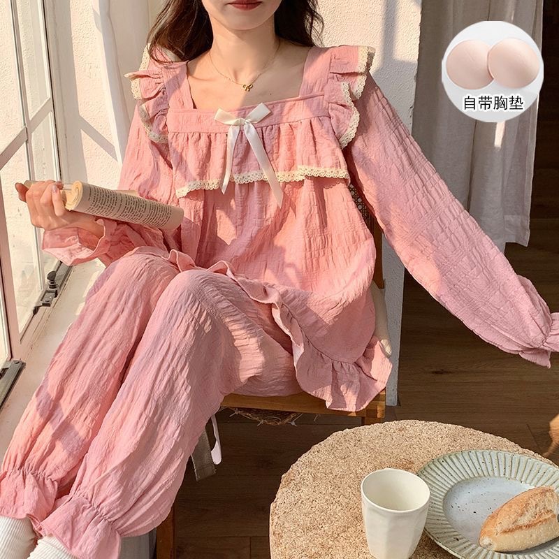甜美睡衣女秋冬季2025新款蕾丝花边蝴蝶结带胸垫家居服套装可外穿