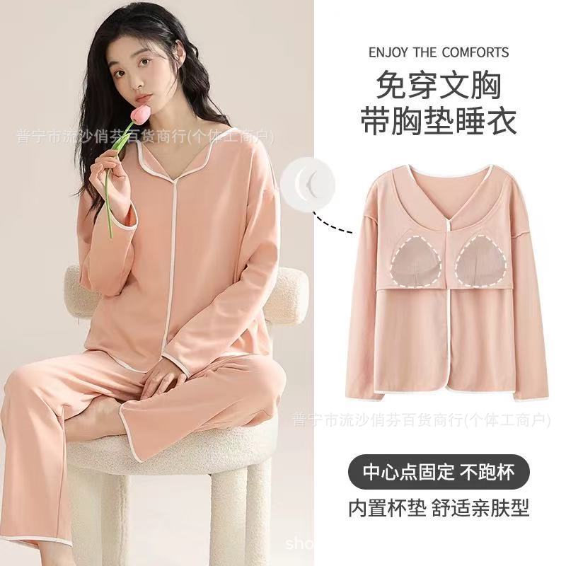 長袖のパジャマの女性は春と秋に胸のパッドの純綿のパジャマを持っています。