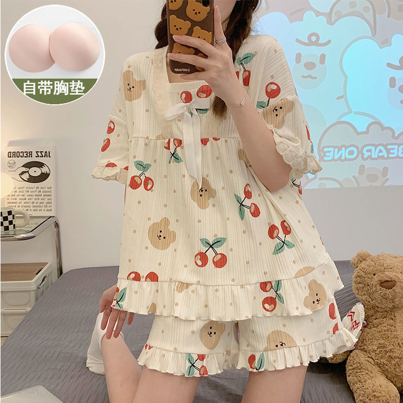 女性用胸パッド付きパジャマ、夏用半袖薄手の膨らみ防止かわいいリボン甘いサマースーツホーム服