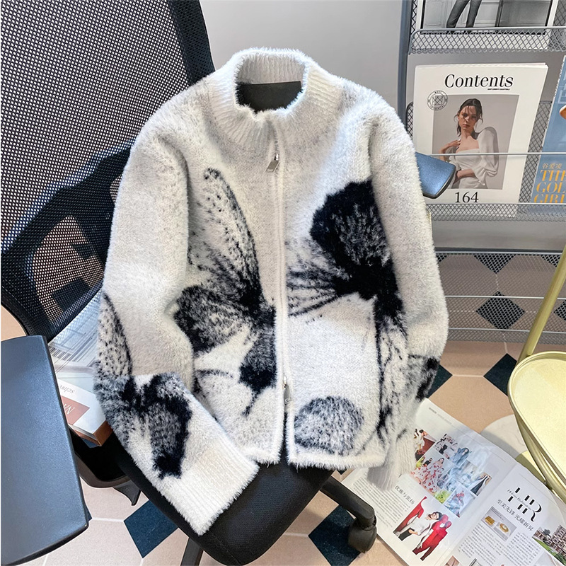 アメリカのレトロなミンクの毛ジャカードの蝶のセーターの女性のデザイン感の小さい大衆の秋冬の双ファスナーのニットのカーディガンのコート