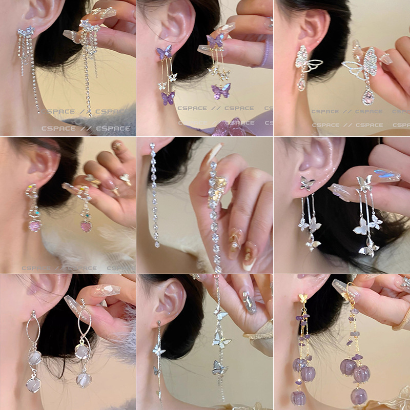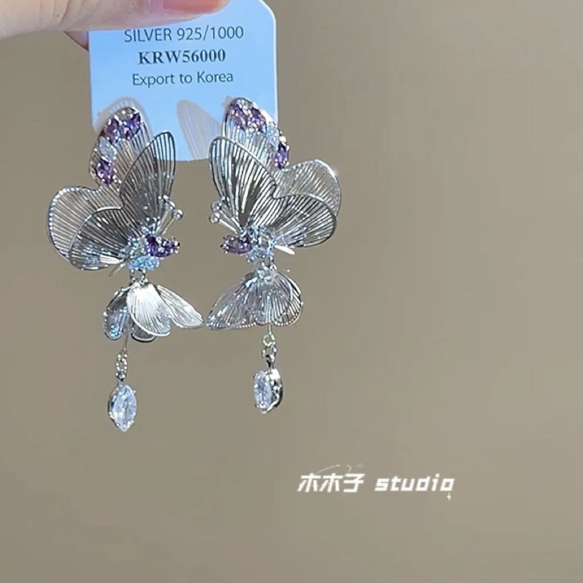 2025新型の清冷感紫色のジルコンの透かし彫りの蝶のピアスの女性の軽くて豪華で精巧で冷たい風のファッション的な耳の装飾品