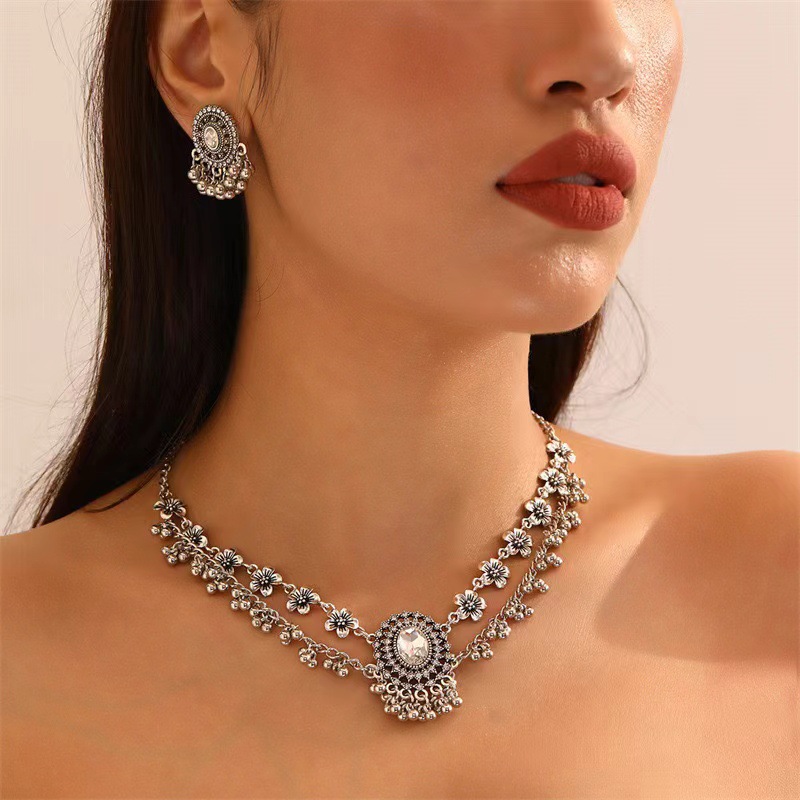 欧米の国境を越えた民族風復古小花二重宝石気質ネックレスイヤリング女性アクセサリーセット