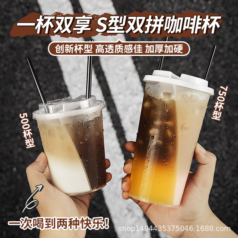 一次性奶茶杯双拼分享杯PP材质双享S型防漏盖奶茶咖啡外带鸳鸯杯
