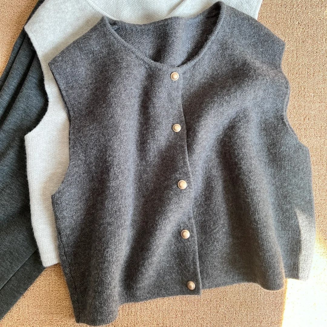 女性用高級メタルボタンニットベスト、春、秋、冬のノースリーブトップス、韓国風無地チョッキ、ソフトでワックスのようなセーター