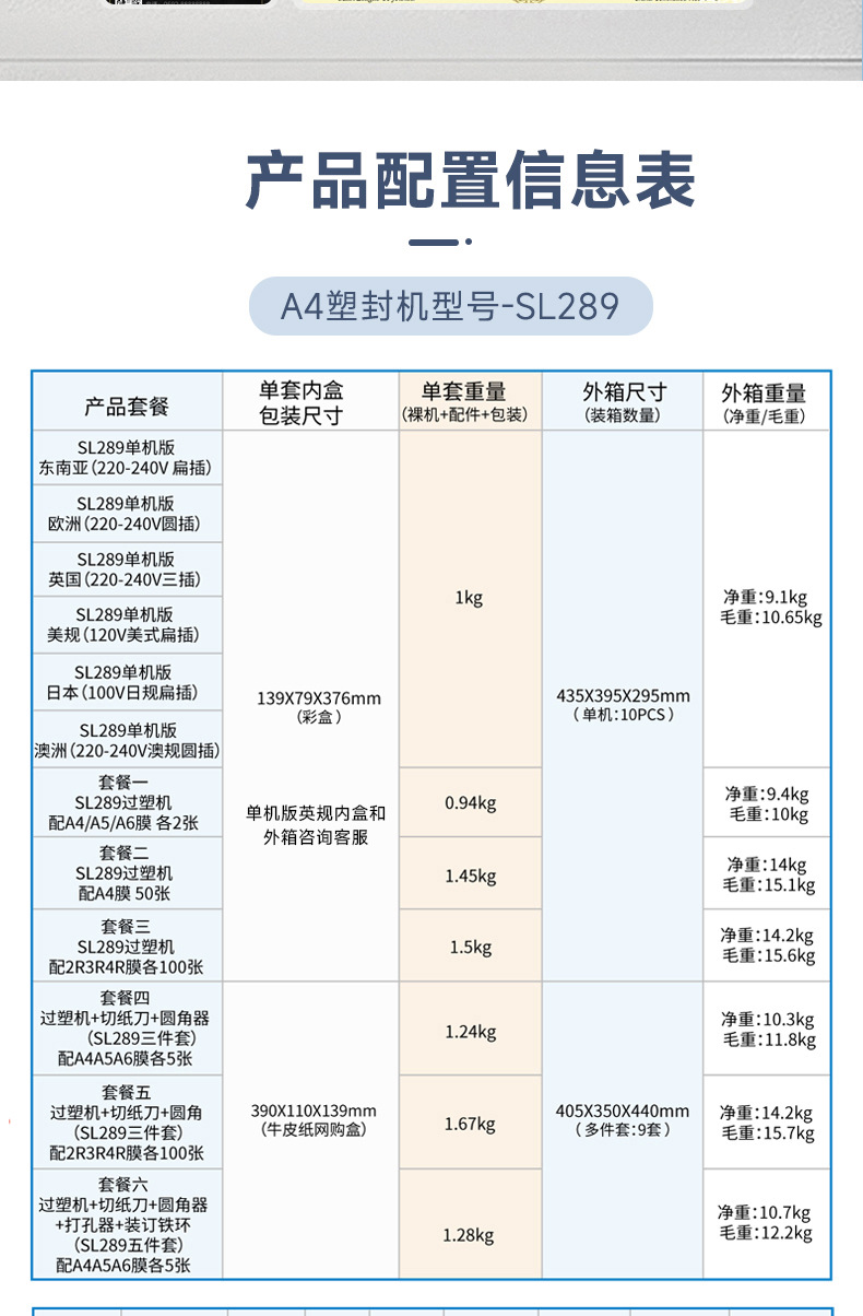 モデル 東南アジア (220-240V 平型プラグ) スタンドアロン版 SL289,ヨーロッパ (220-240V 欧州標準丸型プラグ) スタンドアロン版 SL289,英国 (220-240V 英国標準 3 プラグ) スタンドアロン バージョン SL289,米国規格(120V米国平型プラグ)スタンドアロン版 SL289,日本規格(100V平型プラグ)スタンドアロン版 SL289,オーストラリア規格 (220-240V オーストラリア規格丸型プラグ) スタンドアロン版 SL289,セット1:SL289ラミネート機(仕様書)+A4A5A6ラミネートフィルム×各2枚,セット2:SL289ラミネート機(仕様書)+A4フィルム50枚,セット3:SL289ラミネート機(仕様書)+2R3R4Rラミネートフィルム 各100枚,セット4:SL289ラミネート機3点セット(仕様書)+A4A5A6ラミネートフィルム 各5枚,セット5:SL289ラミネート機3点セット(仕様書)+2R3R4Rラミネートフィルム 各100枚,セット6:SL289ラミネート機5点セット(仕様書)+A4A5A6ラミネートフィルム 各5枚,Qianfan A4 ラミネートフィルム 100 枚
