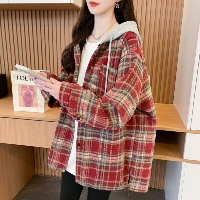 设计感复古格纹连帽卫衣衬衫外套女新款春秋减龄慵懒风中长款上衣