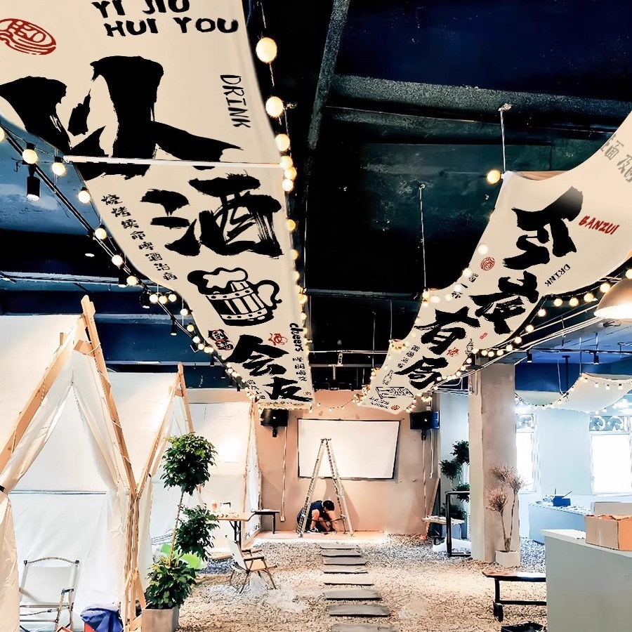 居酒屋の天幕テントのオーダーメードのバーの天井焼きの文字は天井の雰囲気感の背景の布の長い条を飾ります。