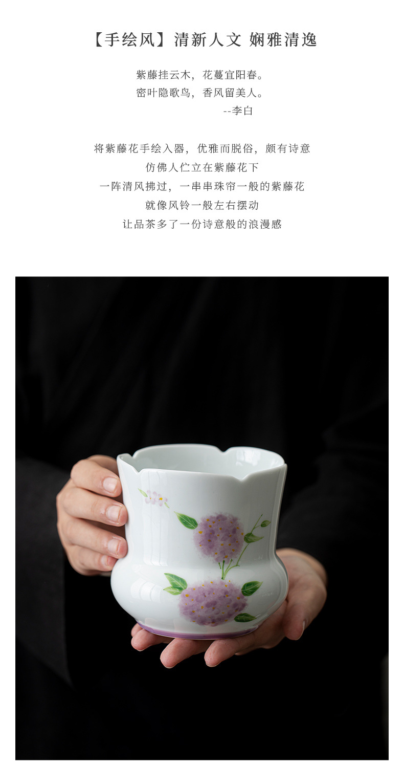 白い磁器の手描きの紫藤の花の水洗いの茶の湯の家庭用の水たけの陶磁器の茶道の部品の廃水のかめの茶のかすの桶