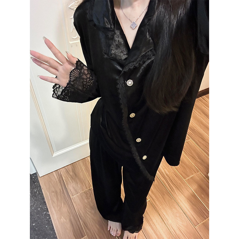【现货】轻奢蕾丝花边冰丝睡衣女夏季薄款凉感长袖长裤家居服套装