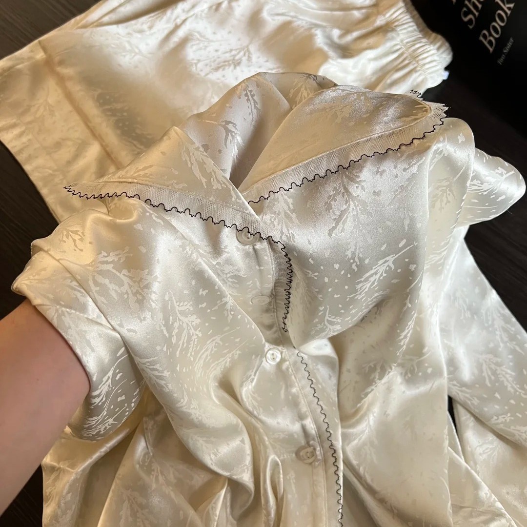 【在庫あり】高級感のあるレースデザインのアイスシルクパジャマ レディース 夏新作 肌に優しく通気性のあるルームウェアセット トレンド