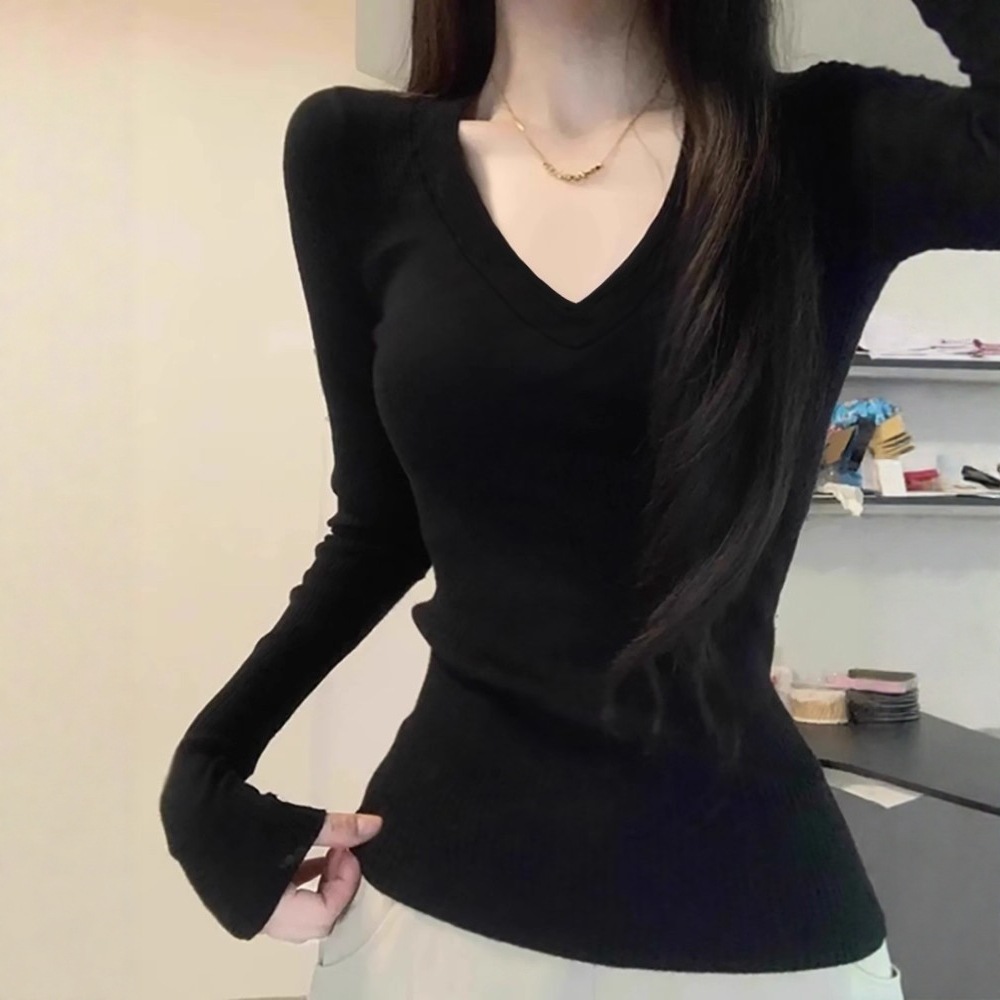 秋冬2025新款V领修身显瘦长袖T恤女时尚百搭简约通勤打底衫上衣潮